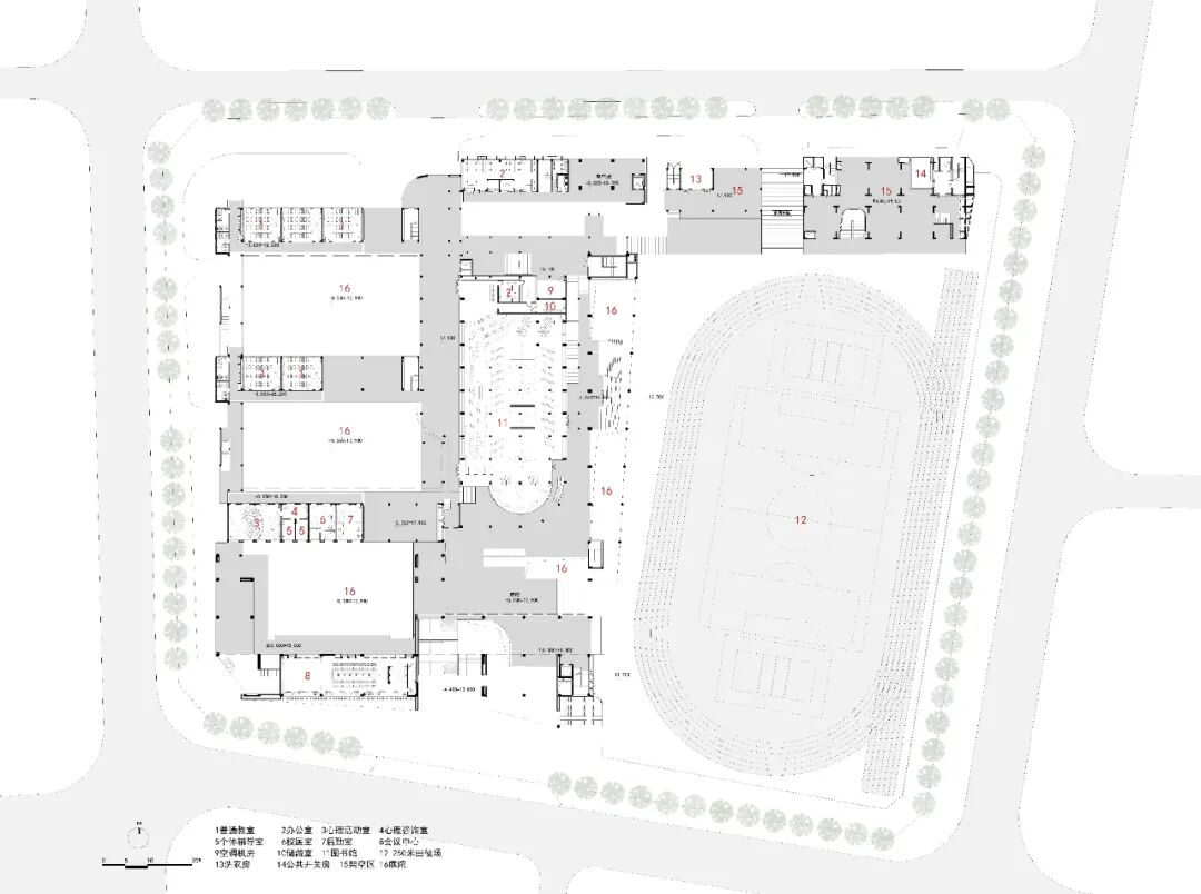 设计将现状200米跑道增扩为250米并置于用地校园东侧,其北侧新建一栋15层教师宿舍(H栋),下部设置食堂及服务配套,形成了完整的生活运动区。因此改扩建后总体功能布局以校园中轴线为界,西侧为以年级为单元的教学庭院教学区,东侧为体育运动生活区,动静分区合理。另外,现状的公益停车场纳入校园用地之后,在新建建筑地下二层增扩停车位,设置不同出入口便于社区共享。