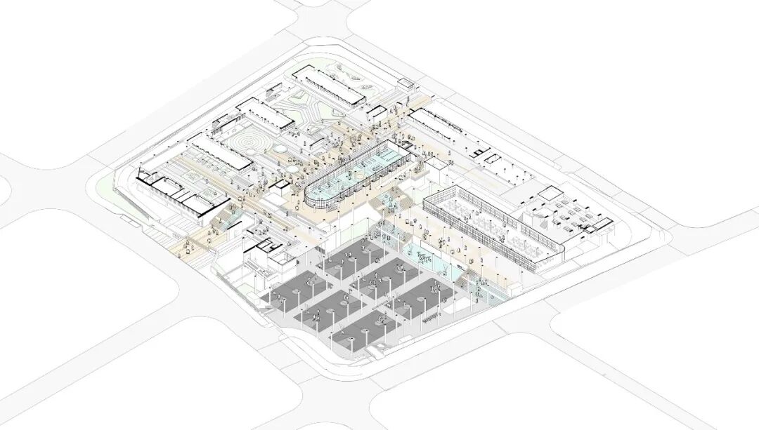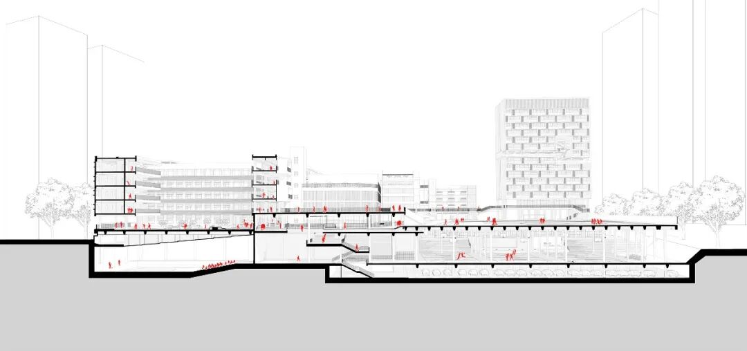 校园新旧建筑并置呈现多栋分散布局方式,需要一个强有力的公共开放空间系统将各个教学单元体有机链接,形成校园空间整体性。大板之下的首层地面空间,设计强调西侧三个教学庭院与东侧架空活动空间、半地下空间的联通和渗透。