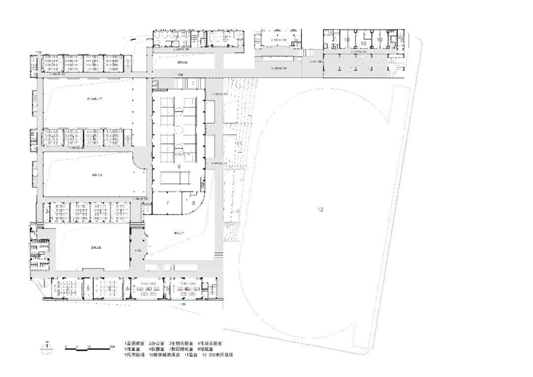 大板之上,新旧教学单元的交通与中轴形成循环闭合回路,并在二层建立与东侧开放空间、运动看台的联系廊桥和平台;同时二层的风雨操场现状封闭东立面改造为通透的格栅界面,强化教学空间与运动开放空间的交通和视觉联系,也满足学生课间十分钟可便捷到达运动操场。连廊、教学庭院和体育场看台、景观式台阶等元素整合构成了连续、流动、一体化的的公共开放空间系统,链接起教学、办公、宿舍、体育等不同功能新旧建筑,校园更显有机整体。