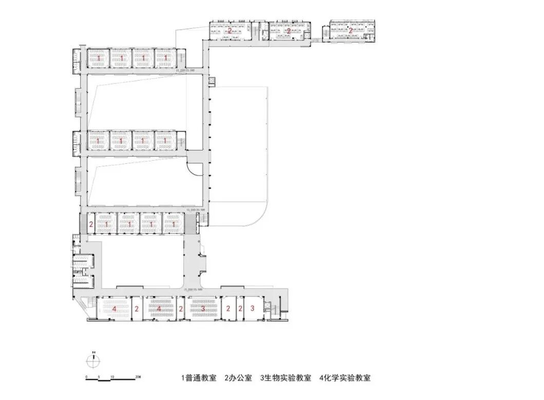 现状教学楼布局呈典型的“日”字型结构,西侧三栋普通教室(ABC三栋),东侧附有图书馆、风雨操场、合班教室,北侧为教师办公与教师宿舍,现状主要入口从校园北侧引入。设计在遵循校园空间结构逻辑下,考虑到毗邻南侧高层住宅日照的遮挡影响,在此新增一栋六层专业教学综合楼(D栋),包括了专业教室、多功能教室、教师办公等功能,校园南北中轴链接四栋教学楼,串联起三个围合的教学庭院。另外,为了满足学校行政办公空间需求,在北侧原有办公楼东侧扩建一栋教师办公楼(G栋)与之相连。扩建后的D栋、G栋与原有建筑教学楼(ABC栋教学楼)共同构成了完整教学区。