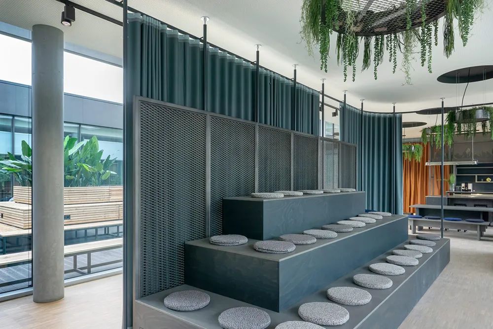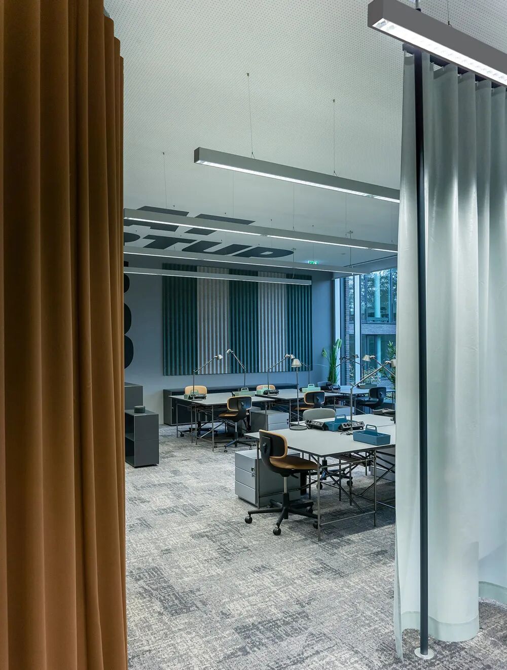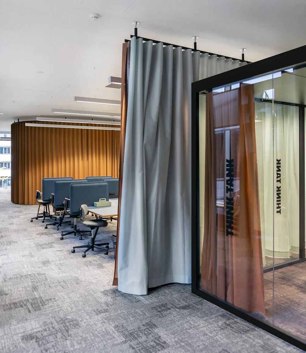 窗帘在不同的工作需求中起到隔离空间的作用,可以让空间自由“呼吸”——从个人独立办公桌到团队协作工作台、或大型研讨会等。