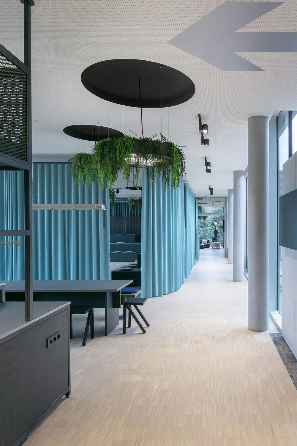 Tags:联合办公/孵化中心,德国、开放多元灵动、围绕核心的环状布局、多功能阶梯座活动区、窗帘、时尚办公网