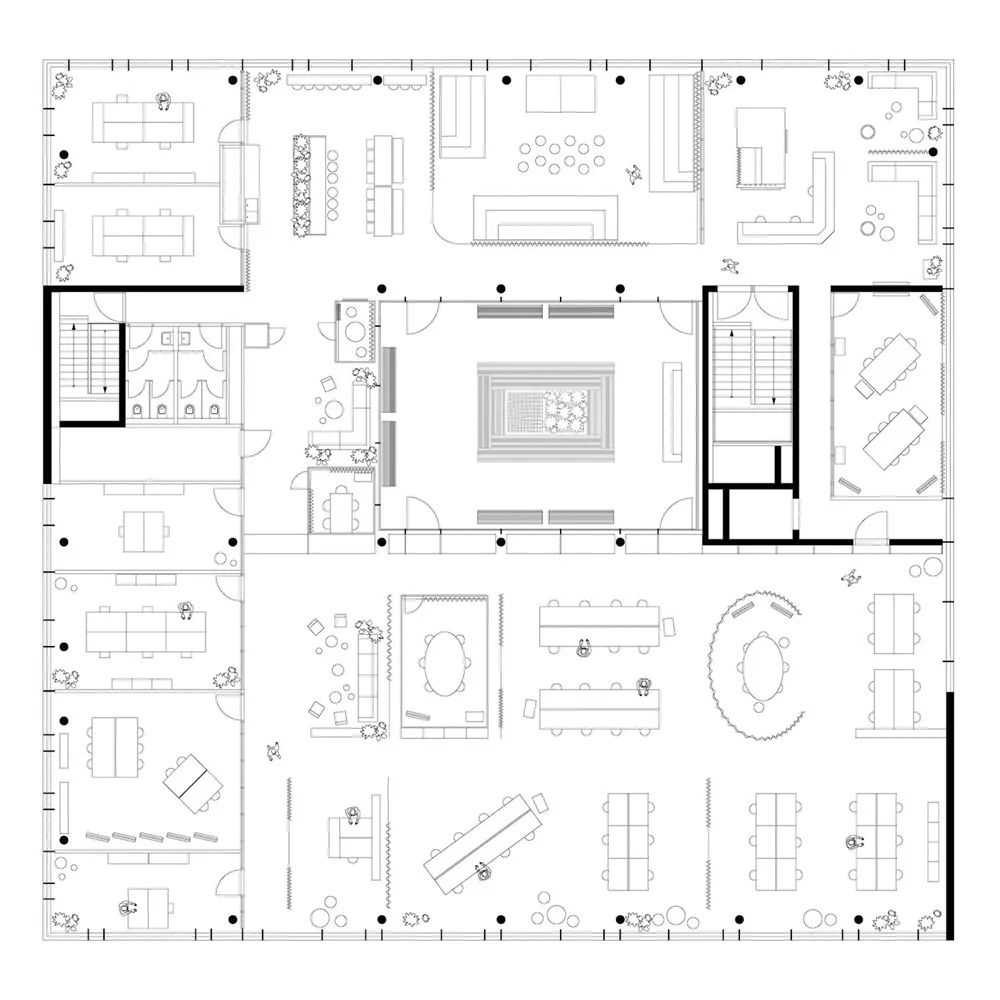 纵观整体平面规划,设计将休息室、办公室、活动空间和讨论区连接起来,形成一个流畅且高效的环状动线布局。设计团队创建以中心庭院为核心、其它功能区环绕周边布置的格局,将所有区域紧密连接起来,从而加速和促进内部的流畅交流、互动和分享。