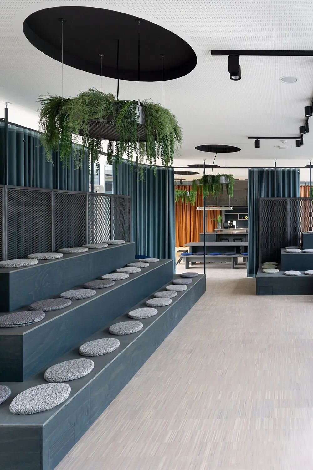 宽敞的阶梯座活动空间是一个多变的地方,可举办演讲、研讨会、团队会议、或影片放映等。在窗帘的包围下,这处活动空间可轻松扩展和打开、或独自封闭围合,以满足多元工作需求。