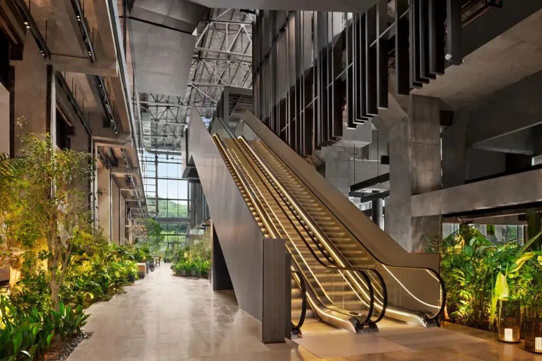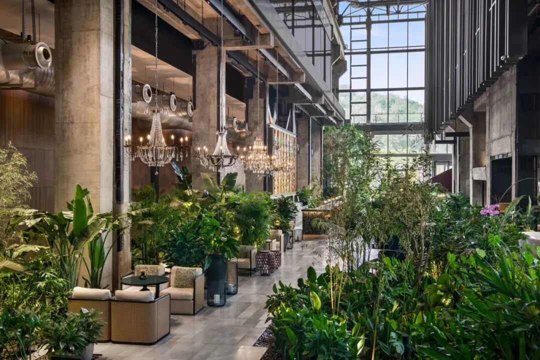 从空间设计到视觉感知,首钢园香格里拉充满绿色盎然的生机。多种常绿植物将酒店大堂装点成富有现代感的室内花园。