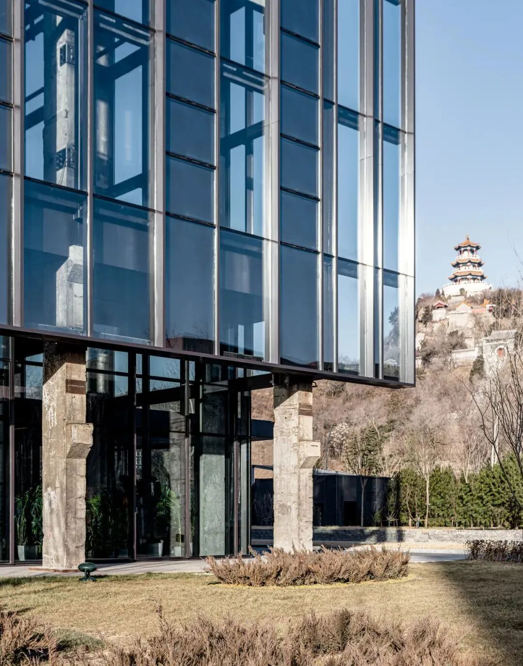 酒店主要由三栋楼体构成。主楼A栋完整保留了原首钢电力厂的混凝土结构和钢桁架,并采用玻璃幕墙将其覆盖。楼体外墙与自然光线交相辉映,如同一件透明的羽衣;人们在室外即能清晰看见被其包裹着的粗犷的工业结构,以及精致的室内环境。
