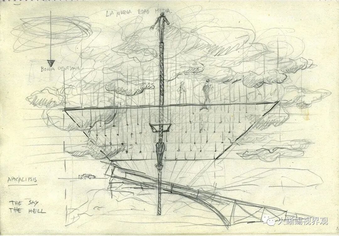 舞台上如何代表天空呢?天空没有地板,所以设计师想到了玻璃。当角色在天空中行走时,观众会觉得角色是在某种无形的东西上行走,就像玻璃是看不见的一样。但玻璃地板需要金属结构,金属结构一旦加入,会让舞台看起来工业化,可能会恰得其反,从而起不到想表达的无形的作用。因此,设计师阿尔方斯·弗洛雷斯(Alfons Flores)不得不想些其他的办法,比如一个没有金属部分的玻璃结构,神奇地悬挂在舞台上。