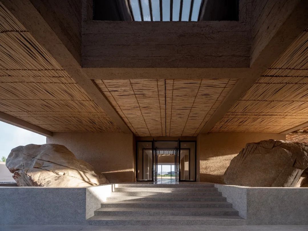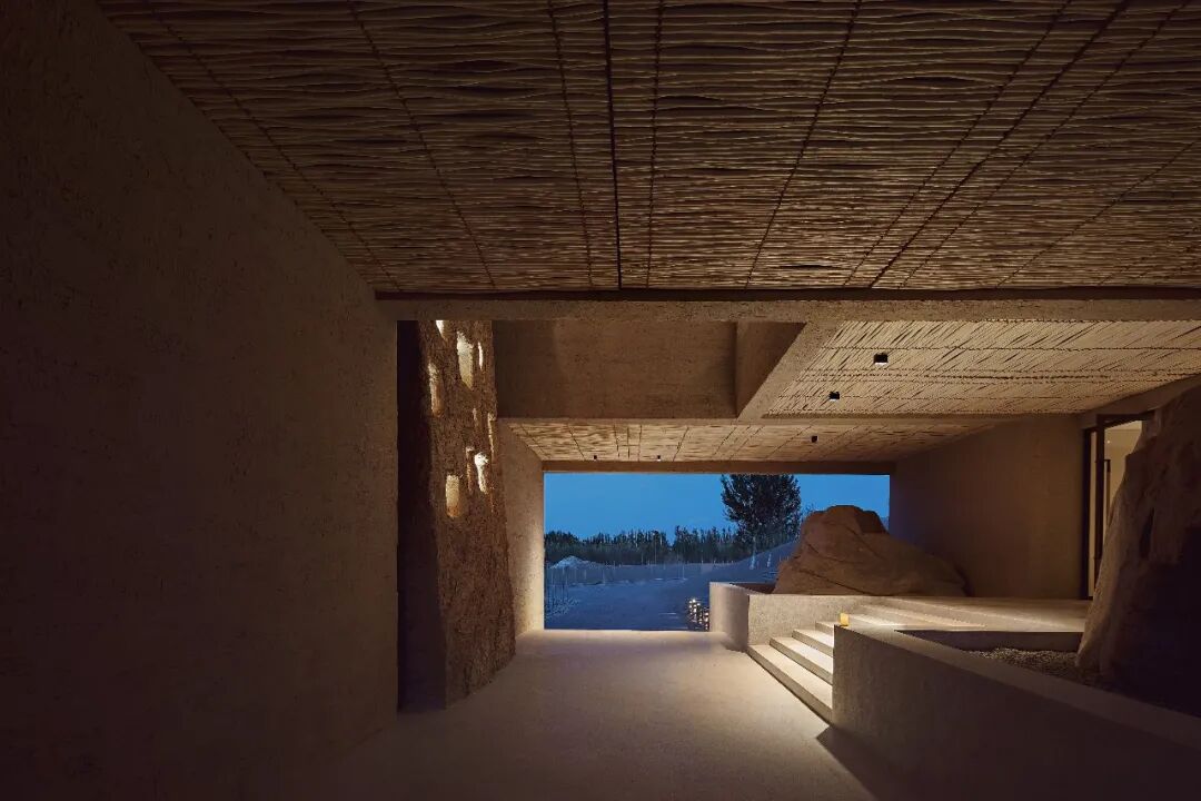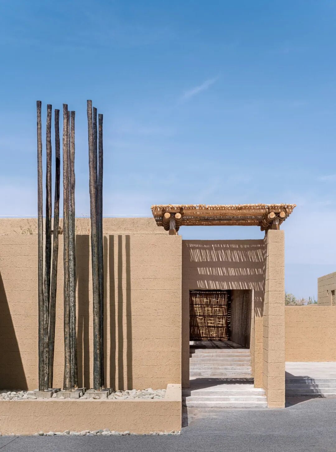 天的纯蓝和沙丘的暖黄,这是园区所追求的两种纯粹。胡杨、房屋和芦苇,像是彼此熟识多年的老友,感受着沙丘温柔的接待。站在园区中感受,建筑犹如从沙地中自然生长出来的,没有丝毫突兀。这是“隐”在空间上的的第二层表达。