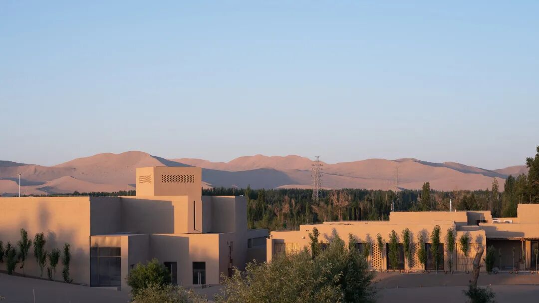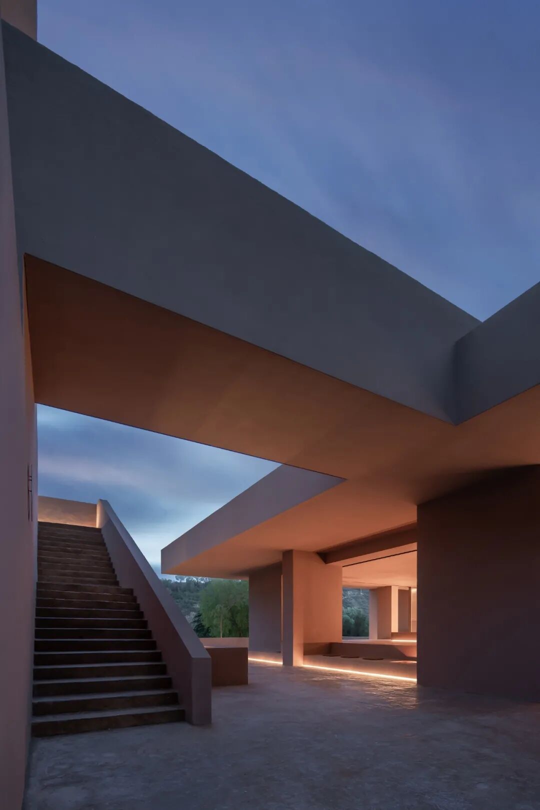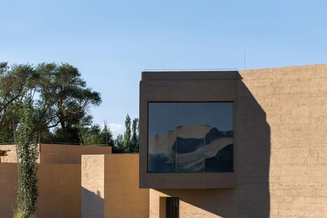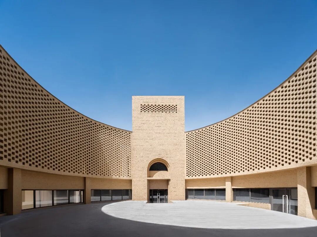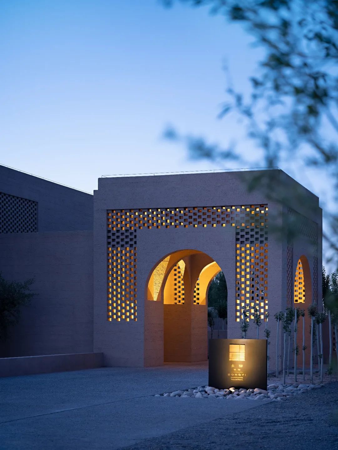 建筑外观方正敦厚,柱梁如骨脊。孔洞的保留可观看一天中光影的轮转,大漠之风日夜无休穿透其中,余音萦绕。整个建筑空间气韵通透,暗合古典东方的精神气质,强调建筑的结构感与光的交互,构建出具有人文活力的建筑语言。