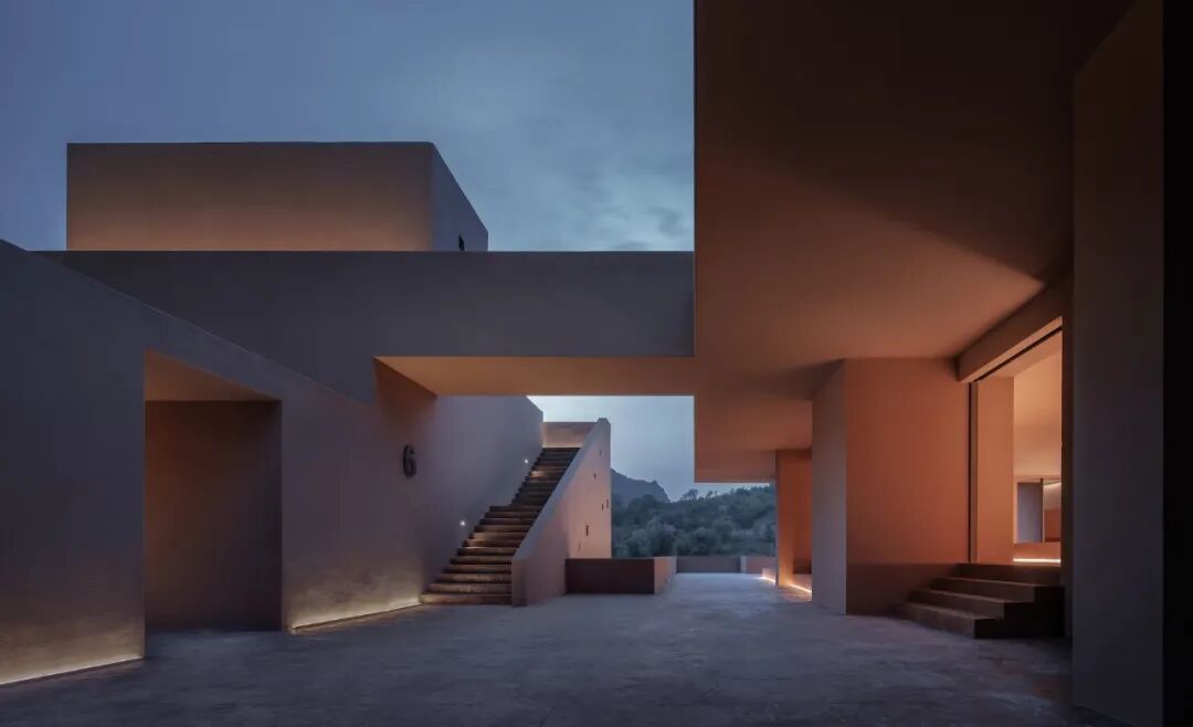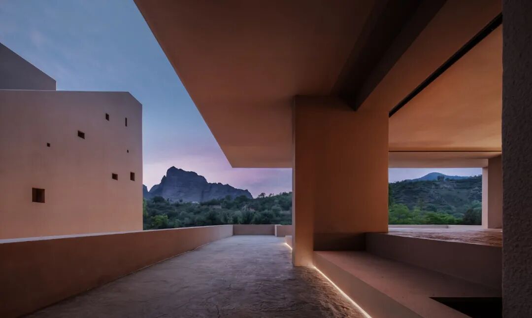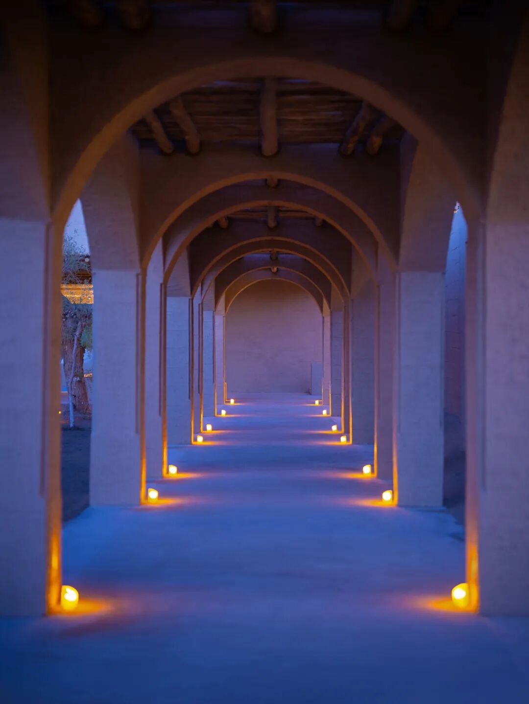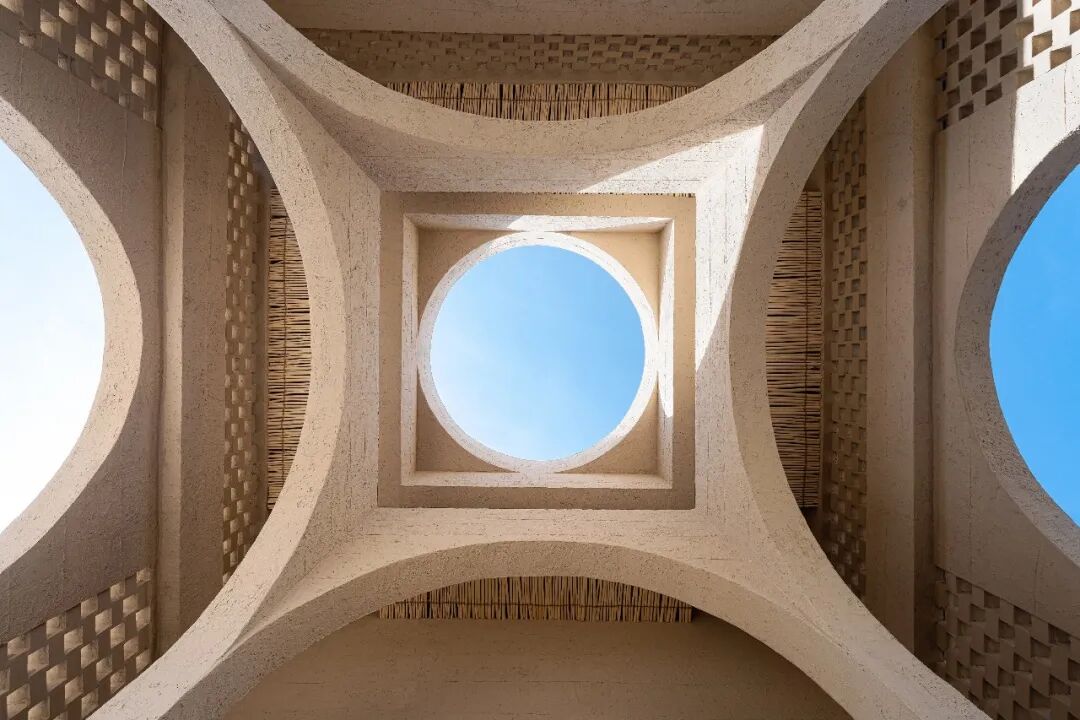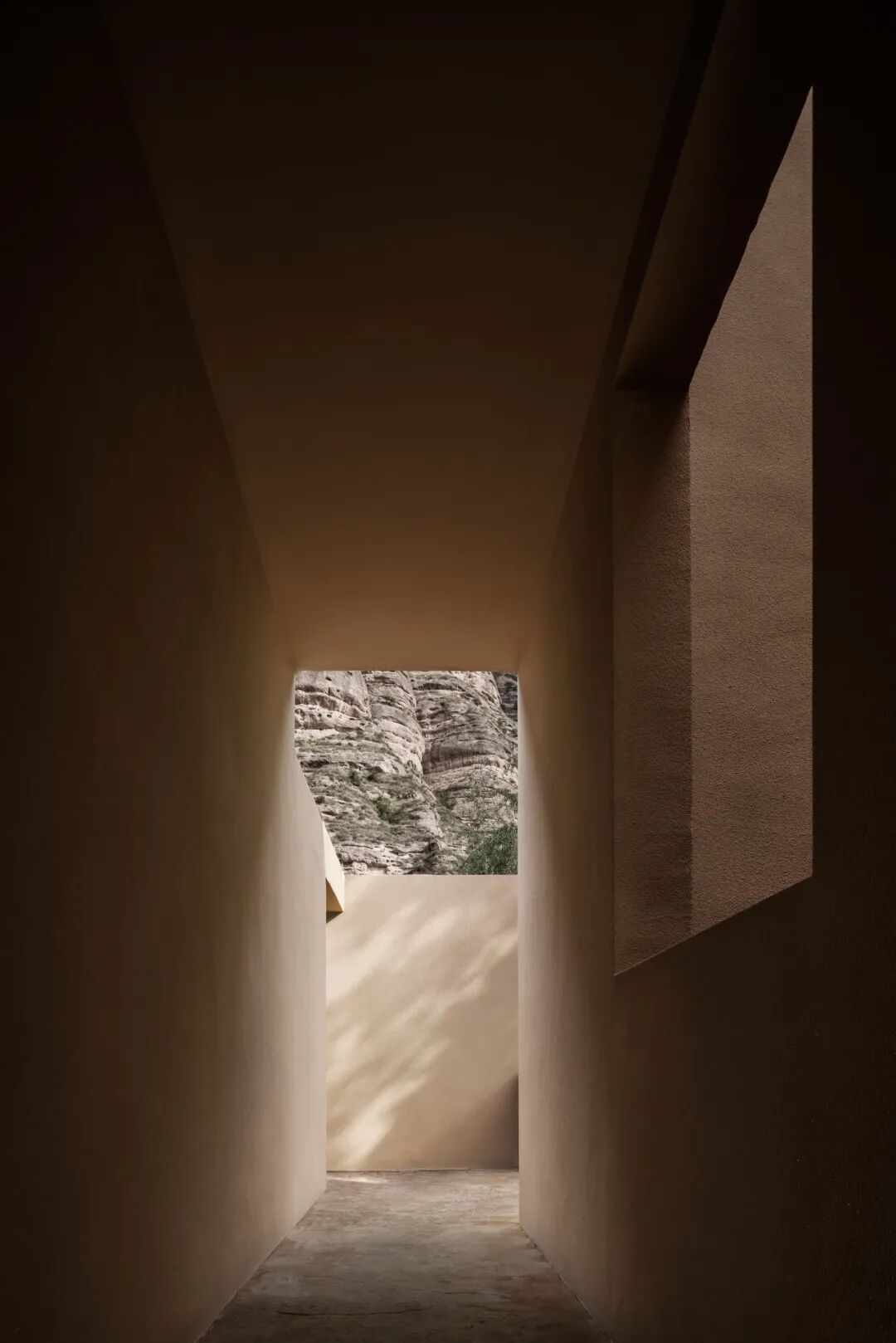 建筑外观方正敦厚,柱梁如骨脊。孔洞的保留可观看一天中光影的轮转,大漠之风日夜无休穿透其中,余音萦绕。整个建筑空间气韵通透,暗合古典东方的精神气质,强调建筑的结构感与光的交互,构建出具有人文活力的建筑语言。