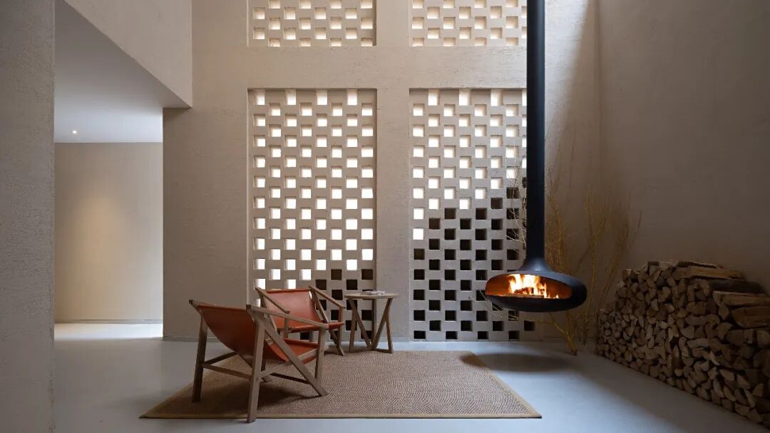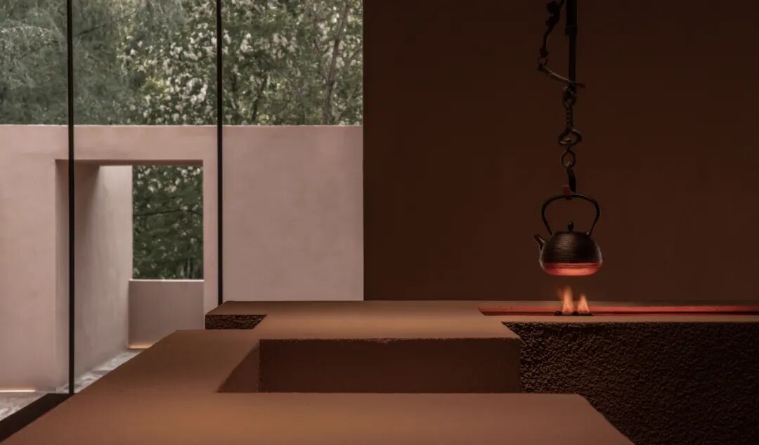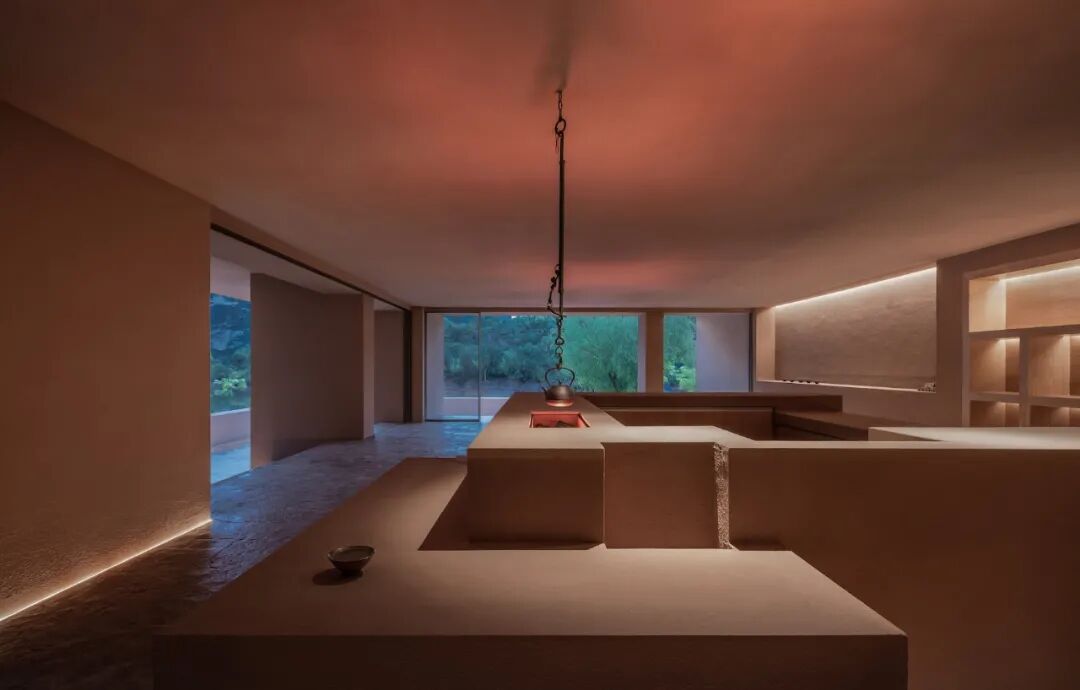 设计自然,皈依自然。空间没有封闭,没有空调,夏天建筑自然通风,辅以蒲扇微风,不光让视觉游离在空间内外,让人的体感与呼吸也能和自然交互!冬天台阶的地暖,火塘里的炭火,呼吸清新的空气,也保持温暖的身体,出于安全的原因,并没有采用明火,而是用了壁炉式的火塘设计。