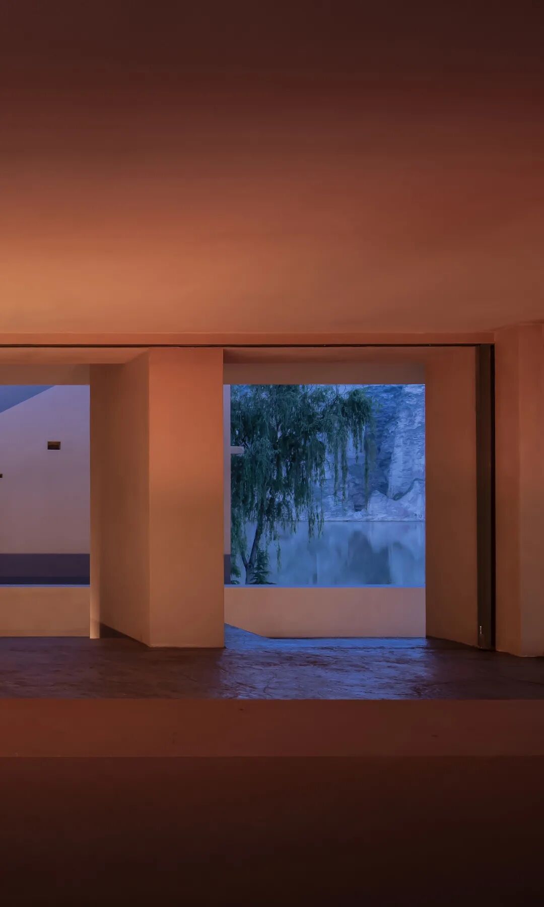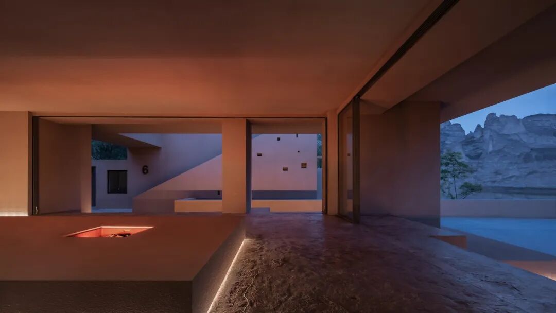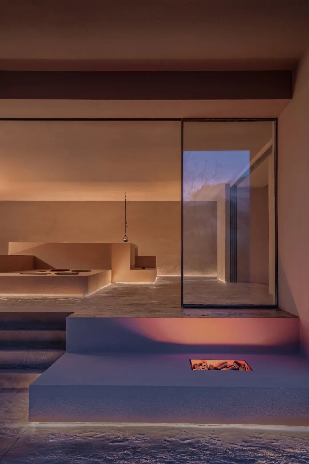 伫立于园区中心的清泉,是整个设计最大的惊喜,也只有做到了足够的“隐”,才能体会到的一种惊喜。泉畔别院围绕在池旁,整体沉入沙地之中,与水面齐平着,削弱了建筑体量感的同时,也让来者感受到了“隐”的第三层空间表达。