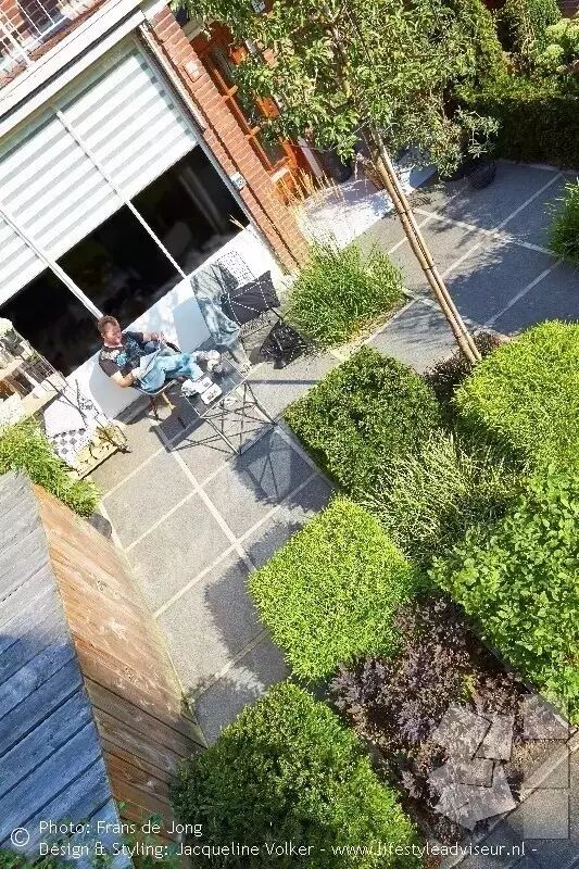 简约的方格铺装及方格形状的植物修剪让整个空间更显设计感。