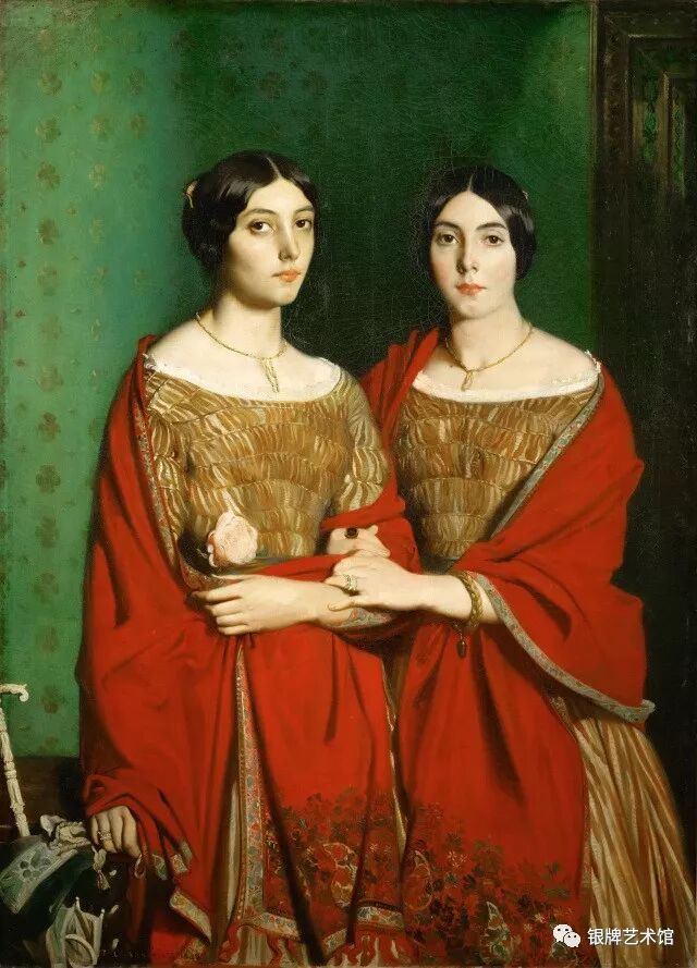 这幅画通过相同的衣着饰物和手挽着手肢体语言表现了两姐妹的姐妹情深。