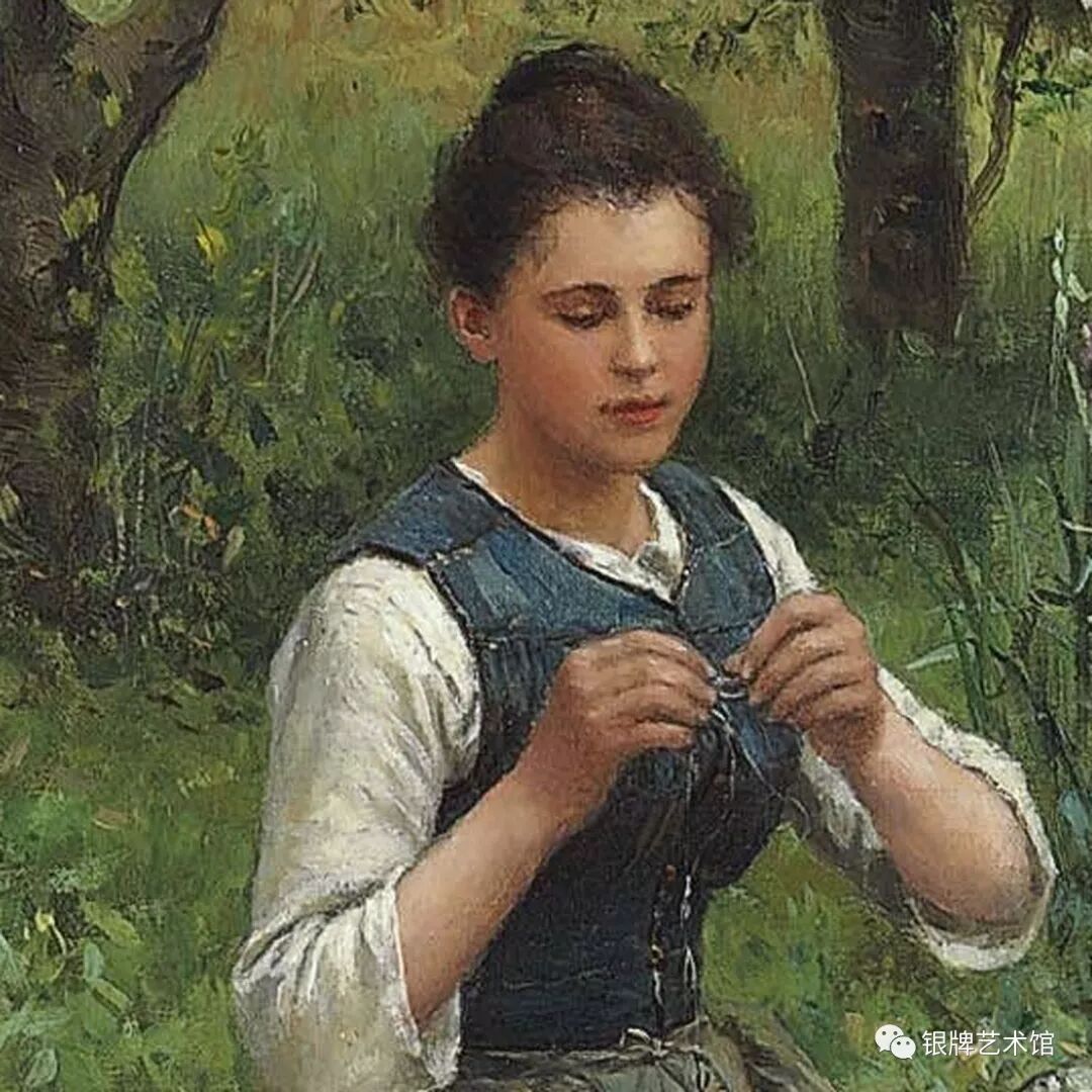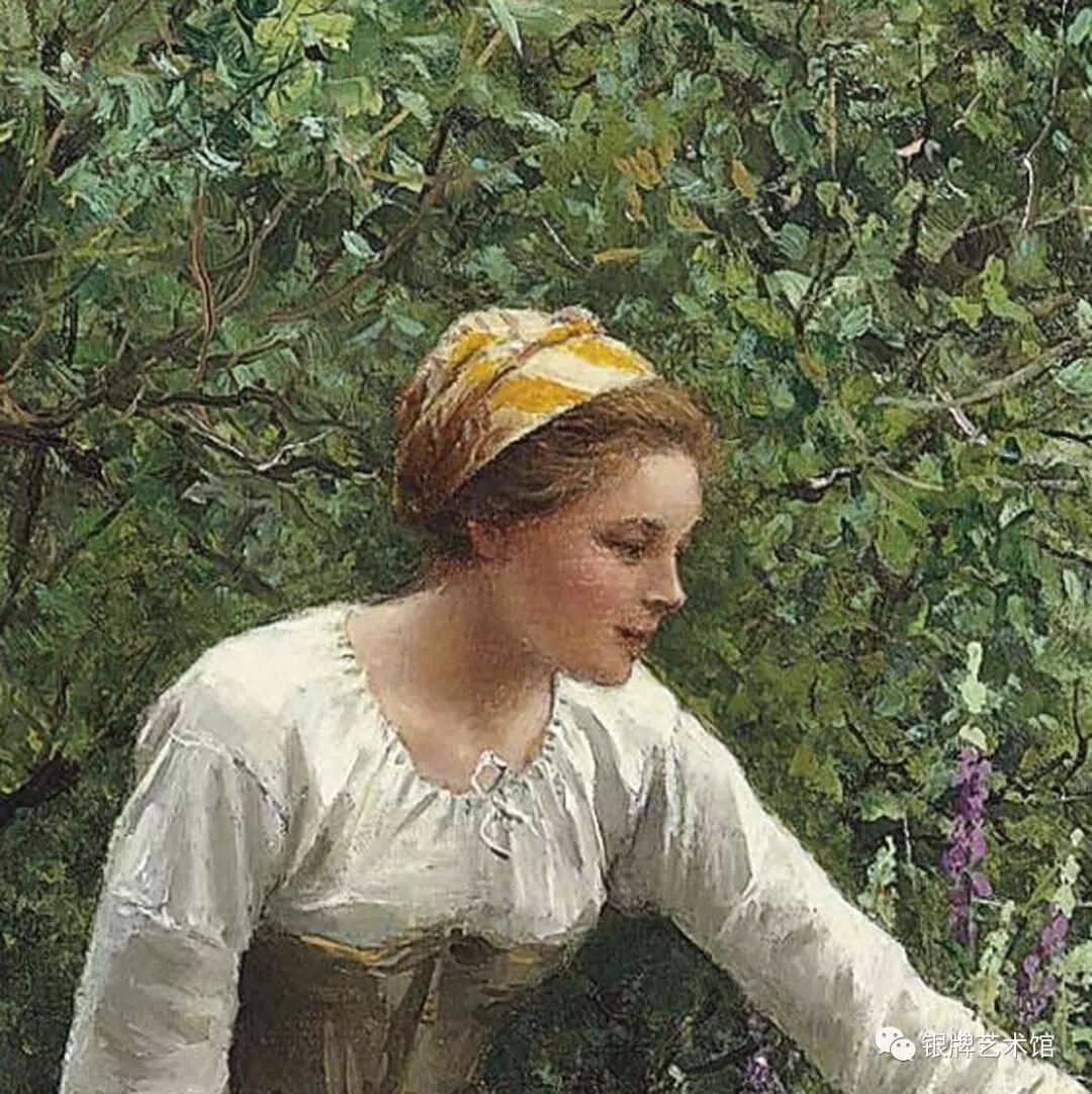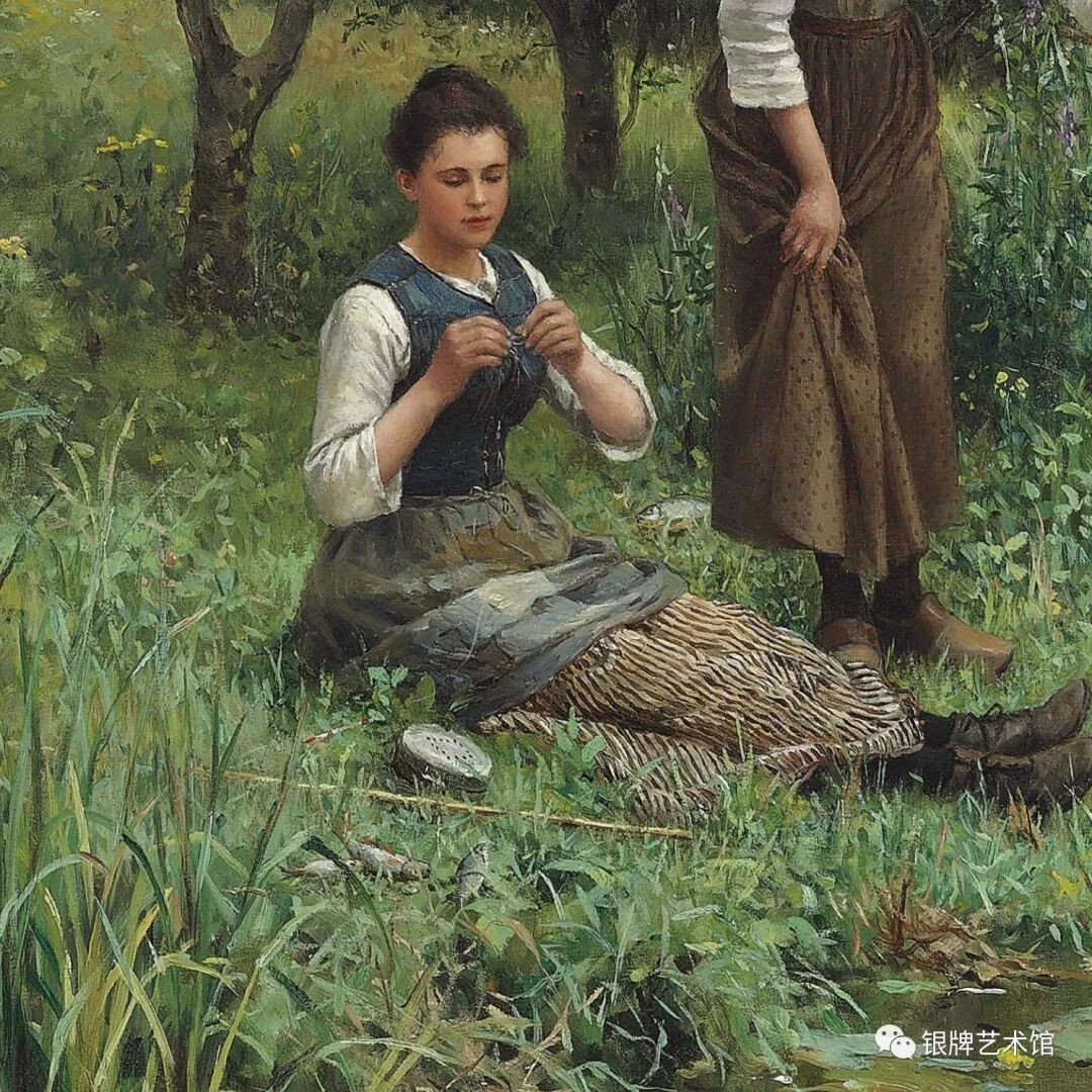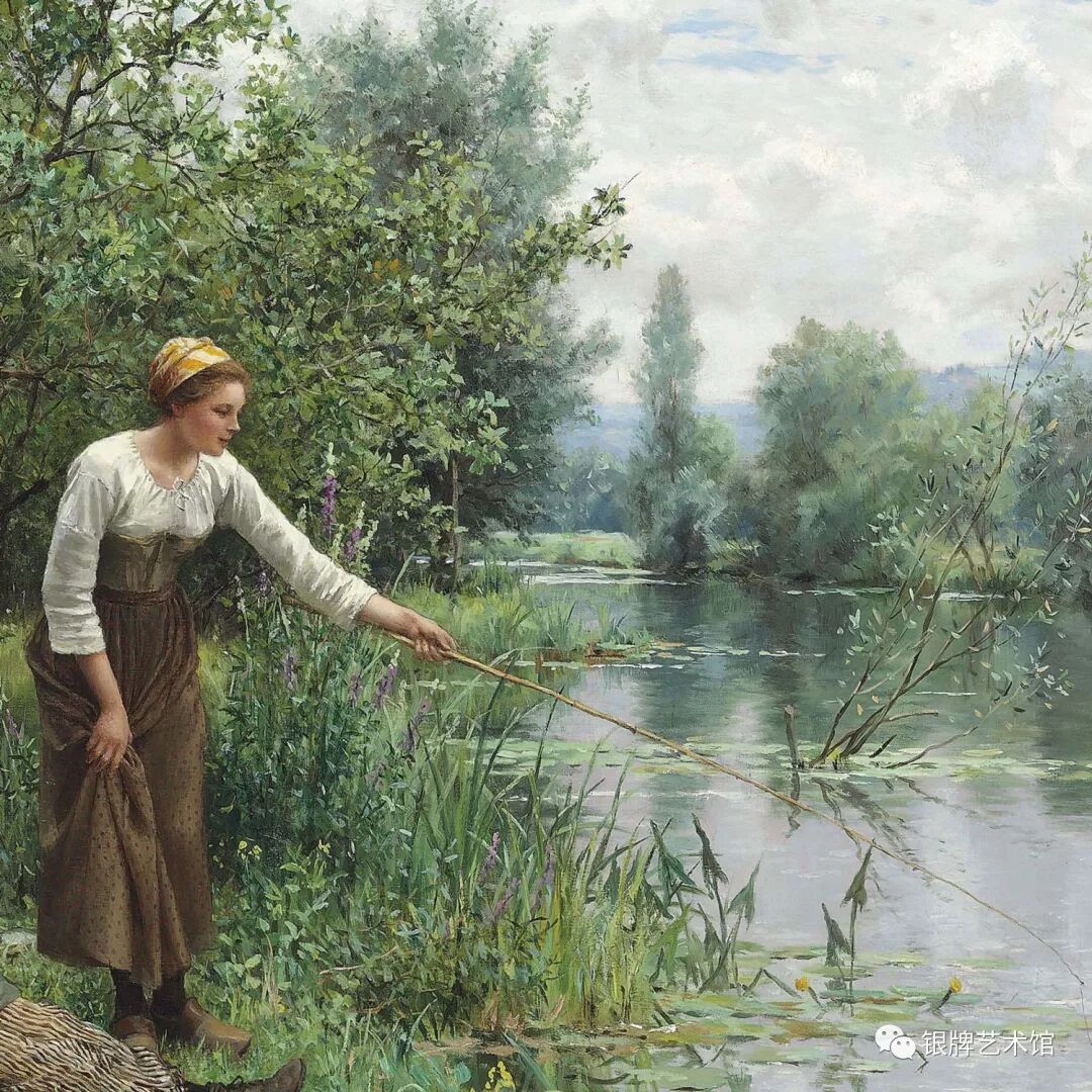 两美人在垂钓 每天两分钟,赏名画,听艺术,大家好!今天给大家介绍美国画家丹尼尔创作于1881年的油画作品《两美人在垂钓》,这幅画描绘了两个女人钓鱼的情景。 局部图 丹尼尔·里奇威·奈特,美国画家。出生于美国宾夕法尼亚州费城,曾在巴黎高等美术学院学习,后居住在法国。 局部图 1889年,他的画作在巴黎世界博览会参展,获得银牌荣誉和十字勋章。 局部图 1893年获宾夕法尼亚美术学院金牌荣誉和迈克尔皇家骑士勋章。他的画作大量是以美女、美景为主题。 局部图 画中描绘初夏时节,两位美丽的农妇来到风景优美的小溪旁垂钓,一个正把细细的鱼竿落到水中,另一个正在上鱼饵,远处是蓝天白云,眼前是绿草碧水,身后是树木农舍,人与自然交融在一起,风光旖旎使观者有如身处仙境之中。