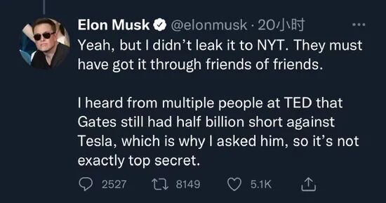 马斯克提及,他在TED那边听到有人传言比尔盖茨在做空特斯拉股票,所以就亲自向当事人求证了一下,而聊天记录可能是朋友泄露的。