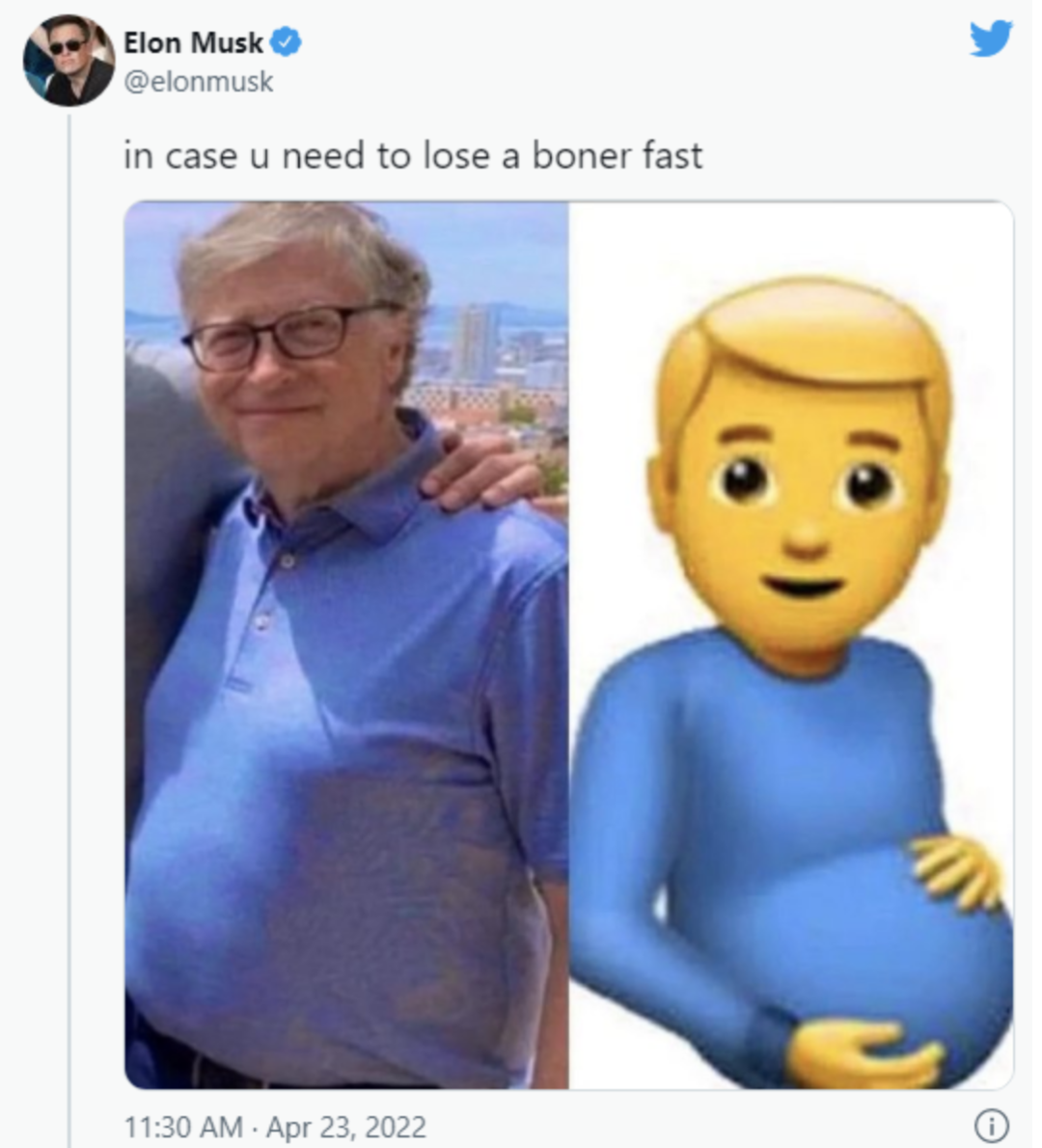 再然后,估计是马斯克觉得那天与比尔盖茨发短信没过瘾,又在推特上贴了一张表情包嘲讽了一下比尔盖茨,如下图。