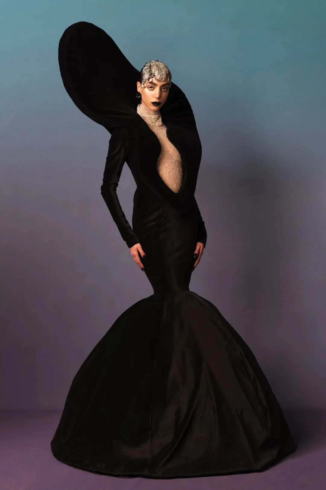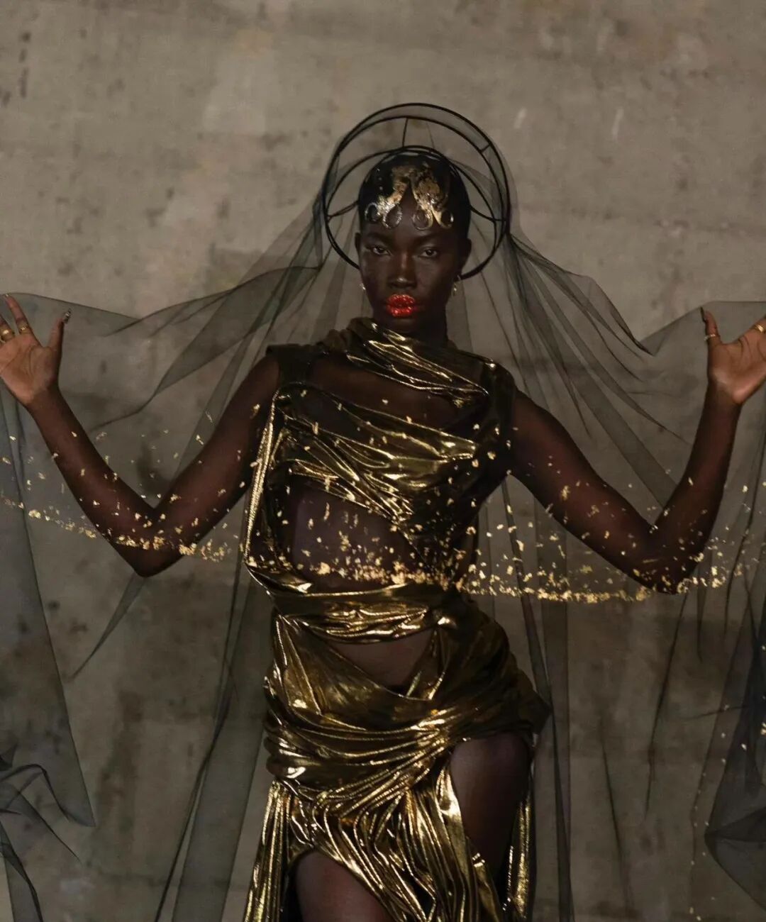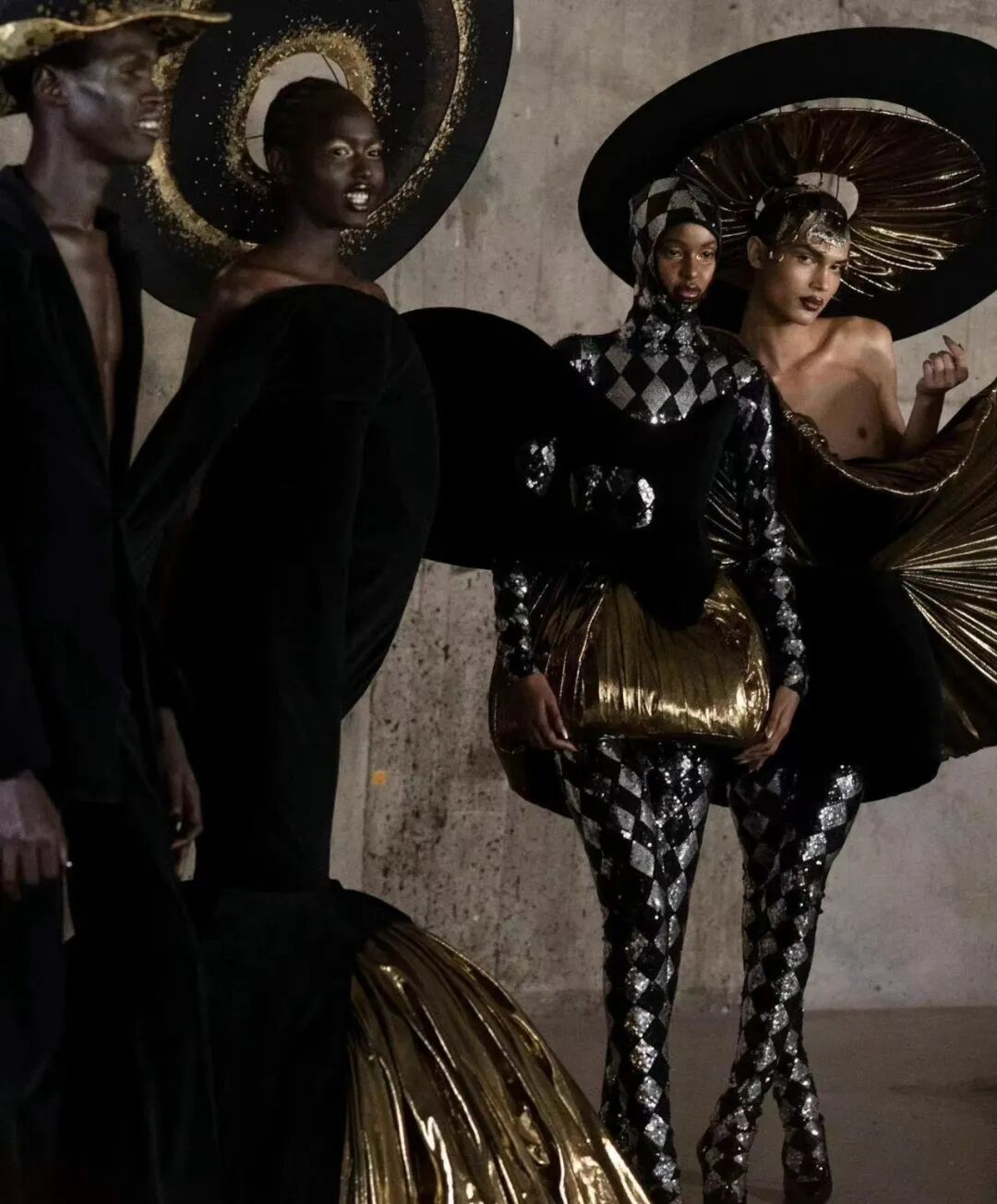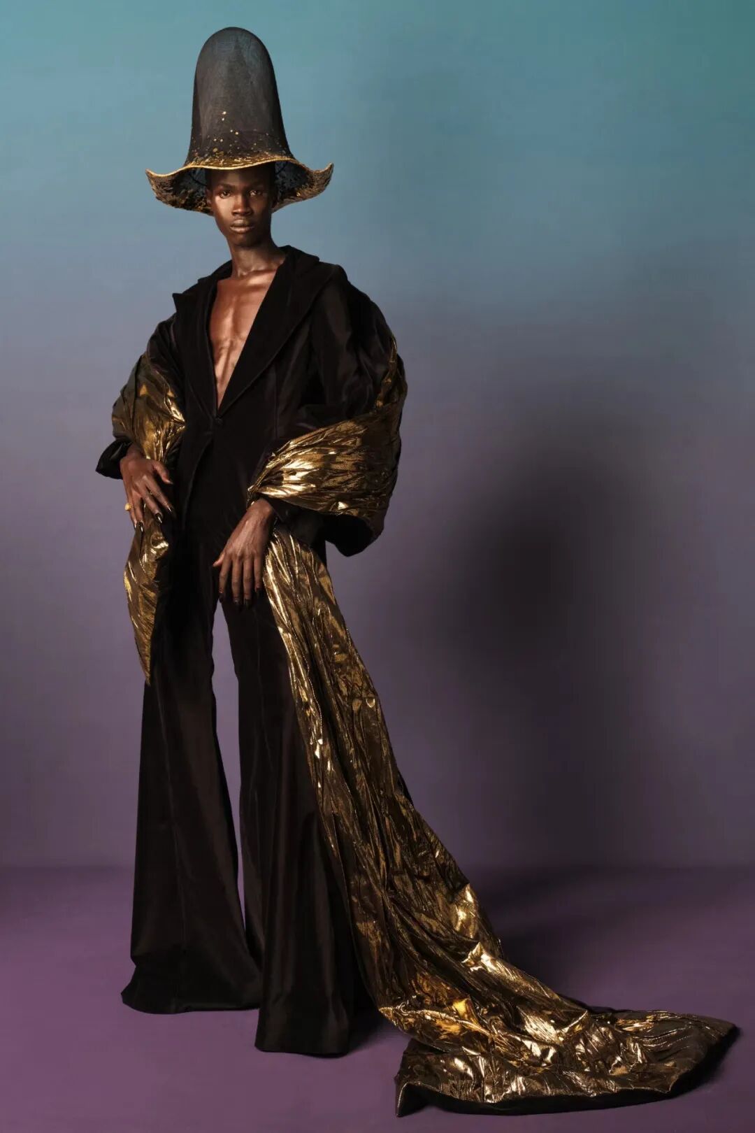Harris Reed 2023秋季全新系列由黑色、闪光、金属感三种主要元素构成十套造型了,华丽又神秘的黑金搭配、廓形结构上的张扬,释放着设计师浓烈的想象力与创造力,似乎整个世界都是他的舞台。