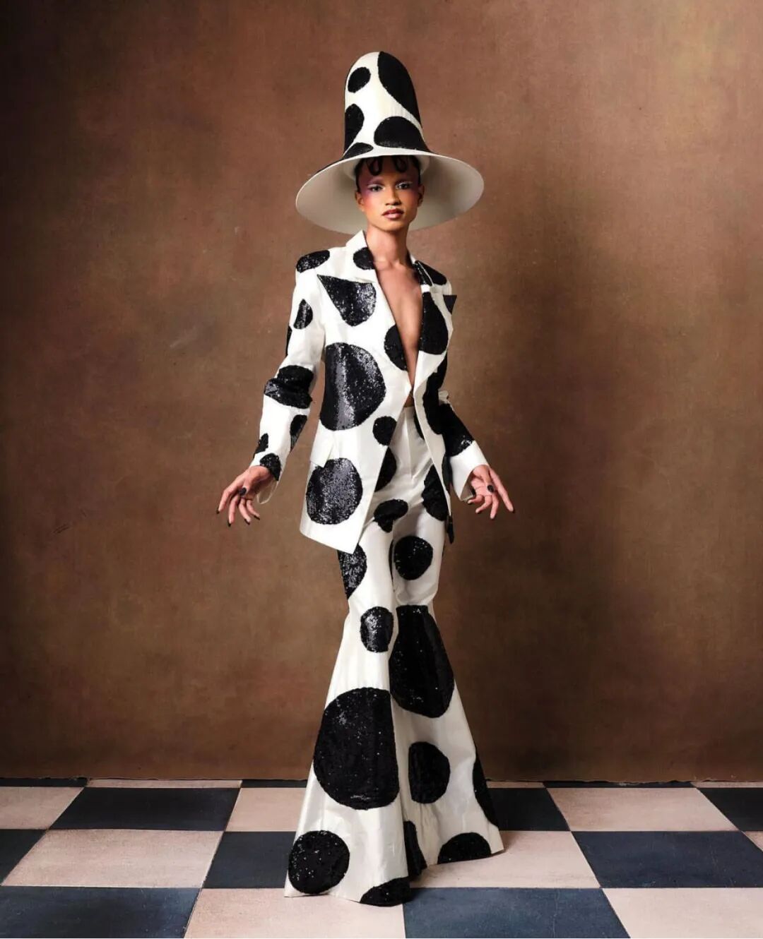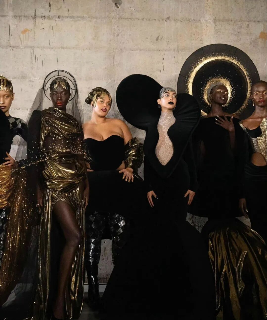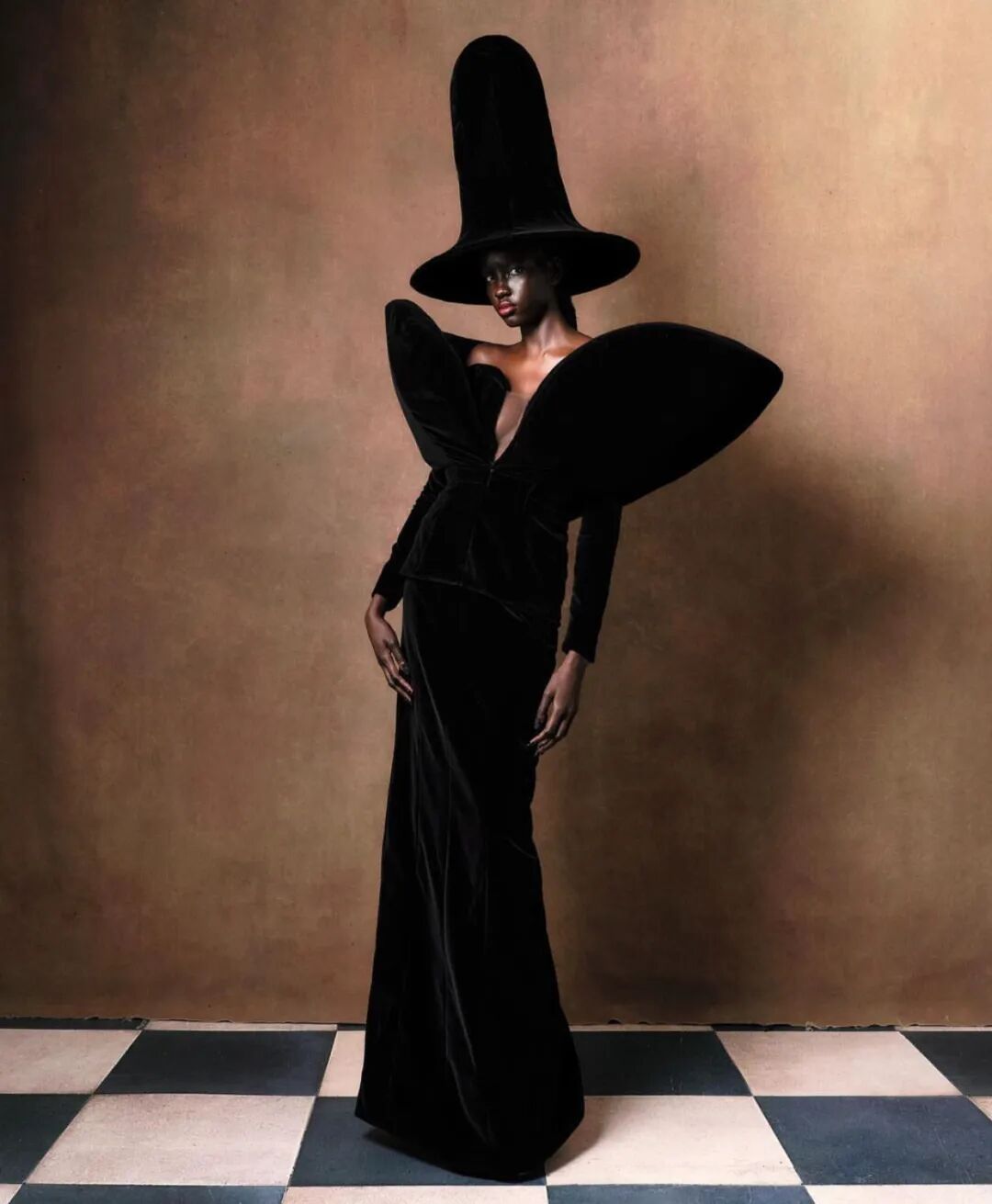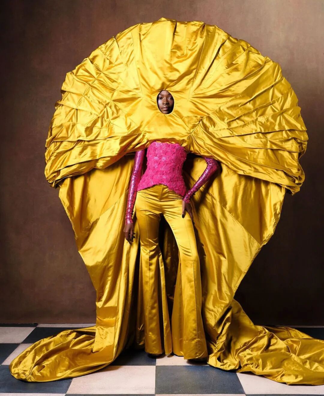 Harris Reed 2023秋季全新系列由黑色、闪光、金属感三种主要元素构成十套造型了,华丽又神秘的黑金搭配、廓形结构上的张扬,释放着设计师浓烈的想象力与创造力,似乎整个世界都是他的舞台。