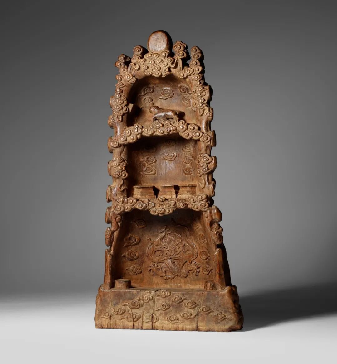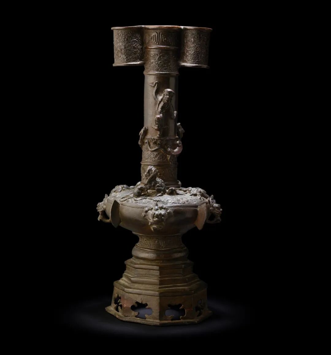 注:大英博物馆藏有一件略大(高50.3cm)并高度相似的明永乐1406年制龙泉青釉带鎏金道教人物三层佛龛,馆藏号 1929,0114.1;一件明初龙泉青釉三层佛龛,售于香港佳士得,2022年5月30日,拍品2819;另一件龙泉青釉洞窟型观音佛龛,售于伦敦佳士得,2012年5月18日,拍品1175,均可资比较。