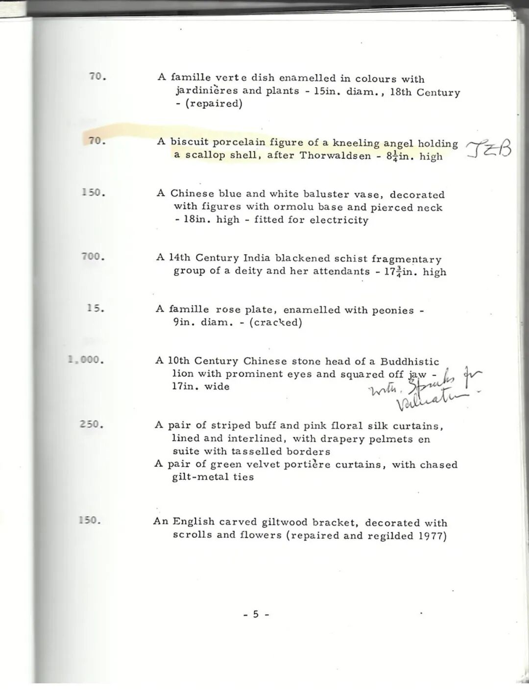 亦附Christie、Manson & Woods Ltd于1977年对此宅邸内容进行保险估价的扫描文件【图二,封面】,第五页【图三】第六条目显示『(£)1,000 十世纪中国石雕佛狮首,双眼圆睁,下巴方形 - 17寸宽』。