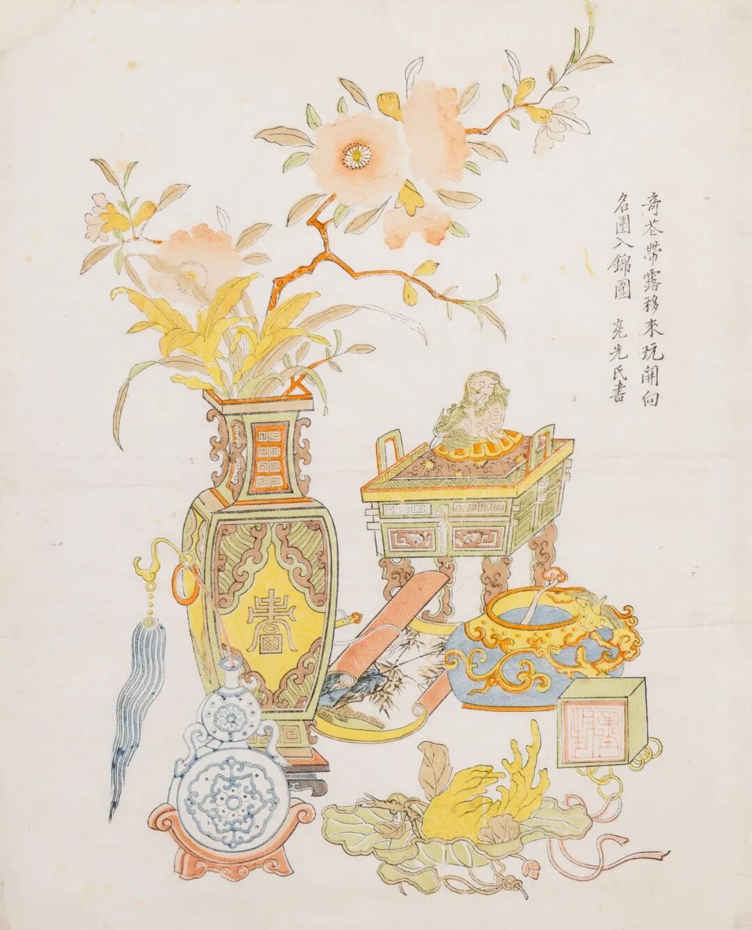 注:丁亮先为清代初期苏州版画的著名工匠,其作品今见于英国大英博物馆、日本王舍城美术馆,且数量不多,国内更为少见。丁氏版画虽罕见,但呈现于此的四幅皆可在大英博物馆找到相似或相关之例:款识『闽海夏深』者,可参大英博物馆馆藏号「1906,1128,0.14」;相关例子,清康熙时期亮先氏落款版画,绘以石榴与螳螂,见于北京中贸圣佳,2019年6月6 - 7日,拍品8664;款识『猩红凝霭』者,参大英博物馆馆藏号「1906,1128,0.6」;与款识『奇苍带露』博古图相似之例,参同上馆藏号「1906,1128,0.6」;相关例子参「1906,1128,0.24」、「1906,1128,0.23」及「1906,1128,0.25」。本拍品之采茶歌图描绘正月、二月、三月之景,藏于大英博物馆的十月、十一月及十二月采茶歌图,馆藏号「1991,1015,0.1」,均可资比较。