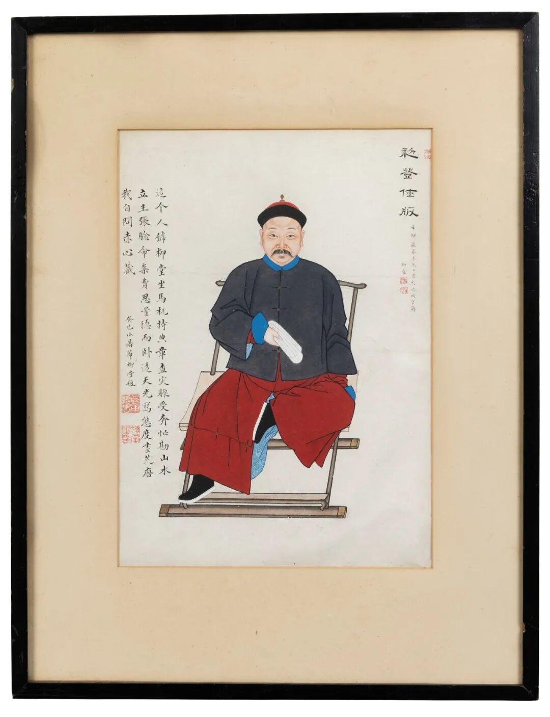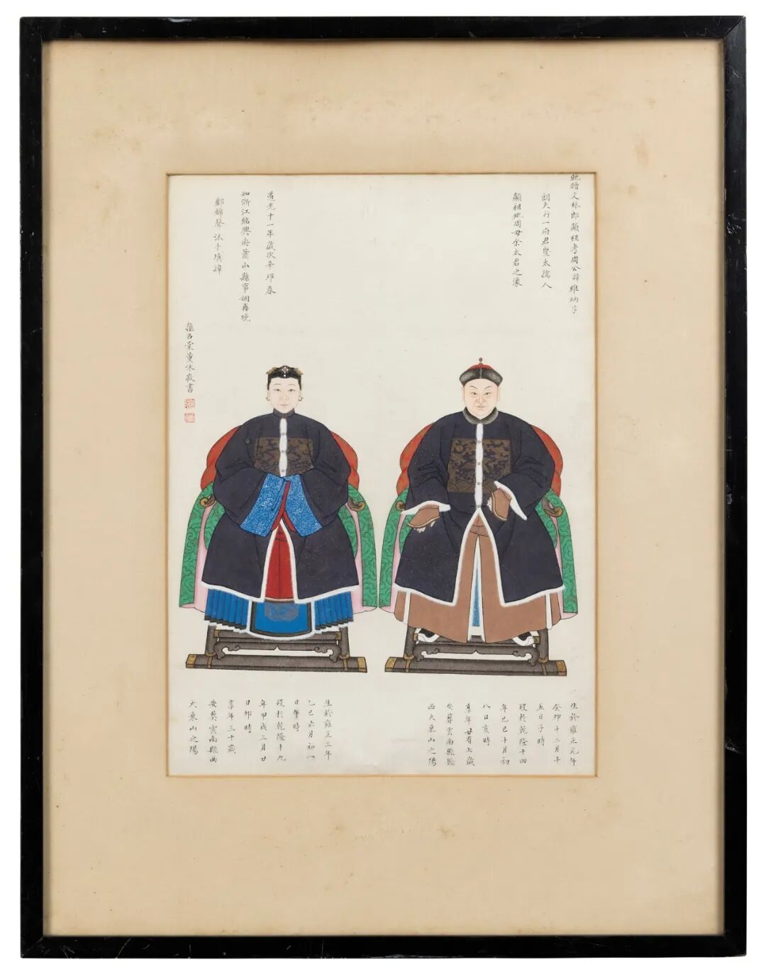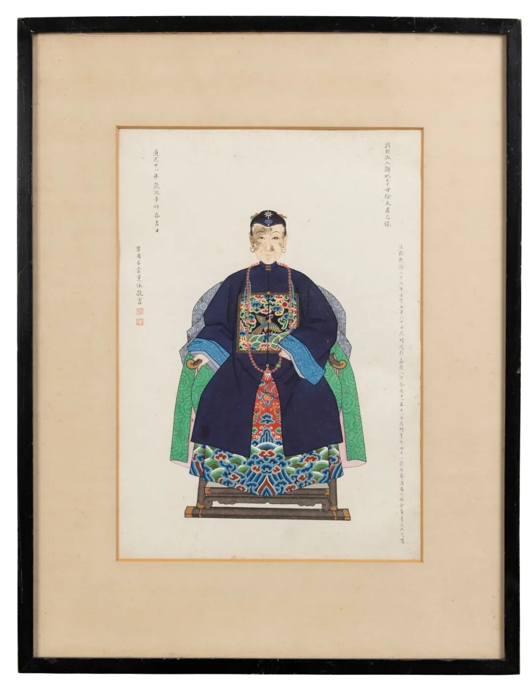 注:周召棠于道光十一年(1831)初登仕版,不仅为自身订制肖像,亦订制了一系列横跨三代之祖先肖像。本组祖先像涵盖周、李及戴氏,详细血缘关系请见附件家族关系树状图。周氏乃召棠血缘姓氏;据召棠纂修的族谱《周李合谱》曰『清乾隆五十六年,周氏九世孙召棠出继李氏六世孙李丰为子。』这也解释了本组祖先像李氏家族的由来;戴氏则为召棠之妻及其岳父之家。画中详尽款识,请参见拍卖行官网。