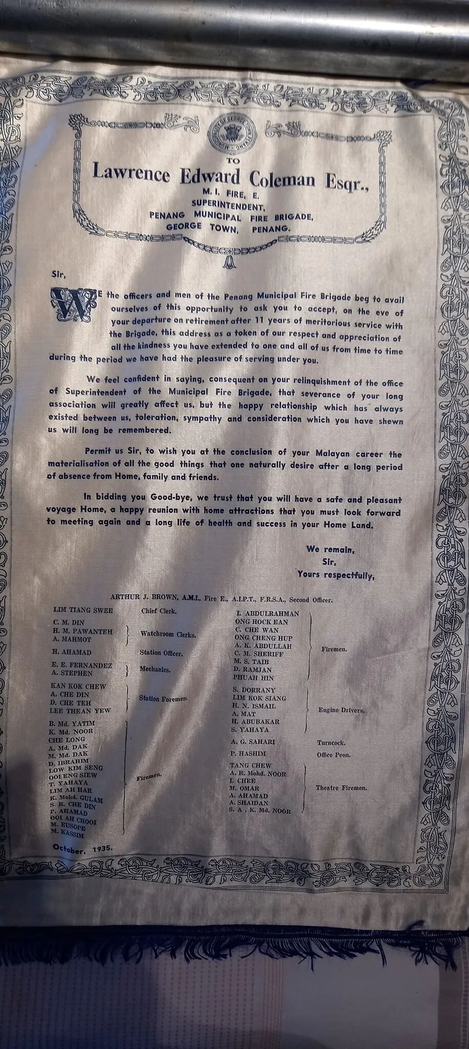劳伦斯‧爱德华‧科尔曼乃现任藏家之叔祖父,于1943年元旦授勋大英帝国官佐勋章。1920至30年代于英属马来亚槟城出任高级消防官员,1939年前携其收藏返英。上图锦旗图由英属马来亚槟城消防局于1935年10月科尔曼荣休时表扬颁赠。