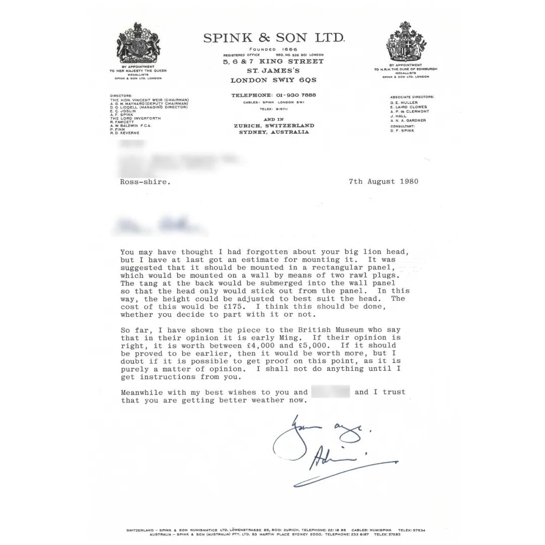 附Spink & Son于1980年8月7日给现任藏家父亲之信函原件【图一】,建议此兽首应『镶嵌在方形底座上』,正如目前所展示一般。此信亦表明当时Spink & Son将此兽首展示给大英博物馆,馆方断代明初。此信署名『Adrian』,或为Adrian Maynard。他于1947年加入Spink & Sons,从1962年起被任命为董事,并最终担任副主席,直到1984年退休。