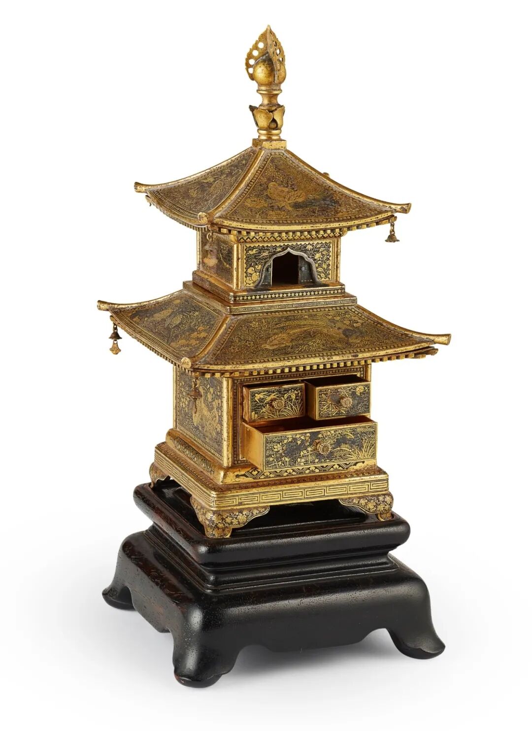 注:一件相似的六角形金工楼阁宝塔置物,同为日本国京都住驹井制款,见于伦敦邦翰斯,2010年5月11日,拍品475;另有类似金工楼阁宝塔置物,驹井款,售于伦敦邦翰斯,2019年11月7日,拍品211;及一件例子售于伦敦苏富比,2007年5月16日,拍品945,均可资比较。