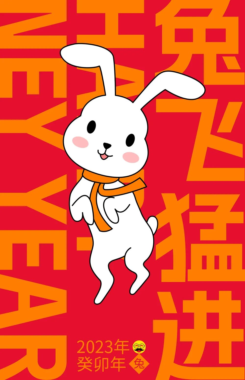 ❻ 加上英文“happy new year”布满整个版面,字体我选用了一个比较现代的无衬线标题字体-阿里妈妈数黑体,兔子叠加在文字上方,“突飞猛进”是主题,不能遮挡太多,而英文是装饰文字,可以遮挡多一些。