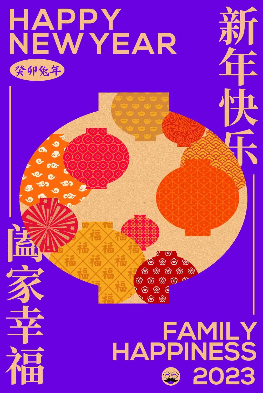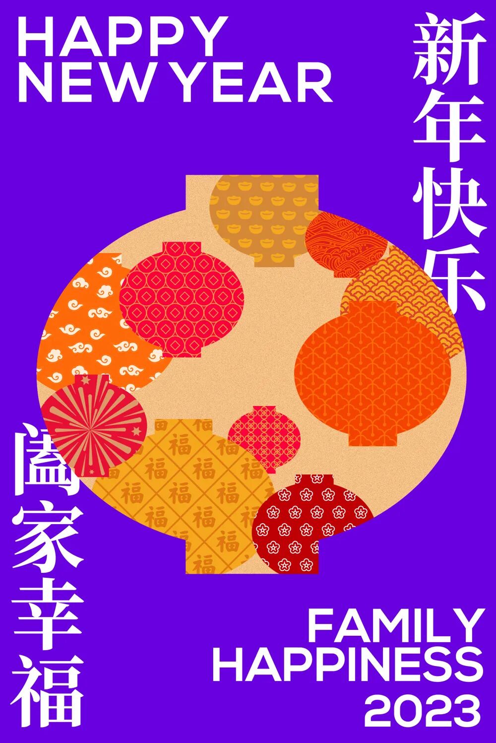 主题我也没有再用谐音梗,而是写了两句大众的新年祝福语:新年快乐 阖家幸福。依据主题,我决定用灯笼来演绎团圆和汇聚。