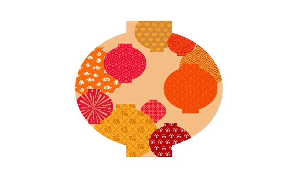 ❹ 只是单纯的灯笼图形效果太单调,我们可以在这些小灯笼里填充一些跟春节相关的元素,比如烟花、祥云、福字、金元宝、铜钱等。