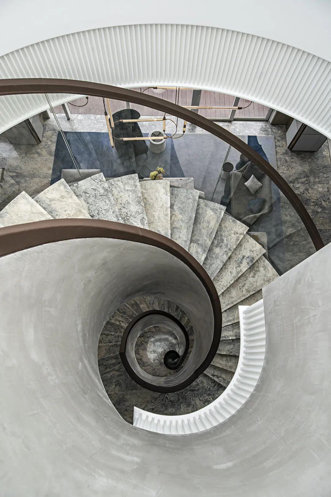 圆形的楼梯承上启下,成为整个房子的视觉中心,拾梯而上就是二楼起居厅和更私密的客房。