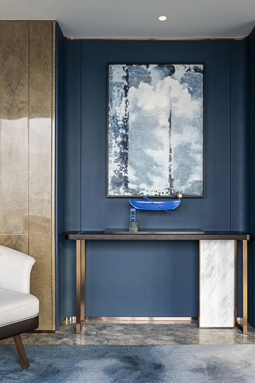 步进大门,具有时尚艺术品味的书画艺廊映入眼帘。玄关墙面局部采用了海蓝色的涂料,衬托墙上的格调收藏。