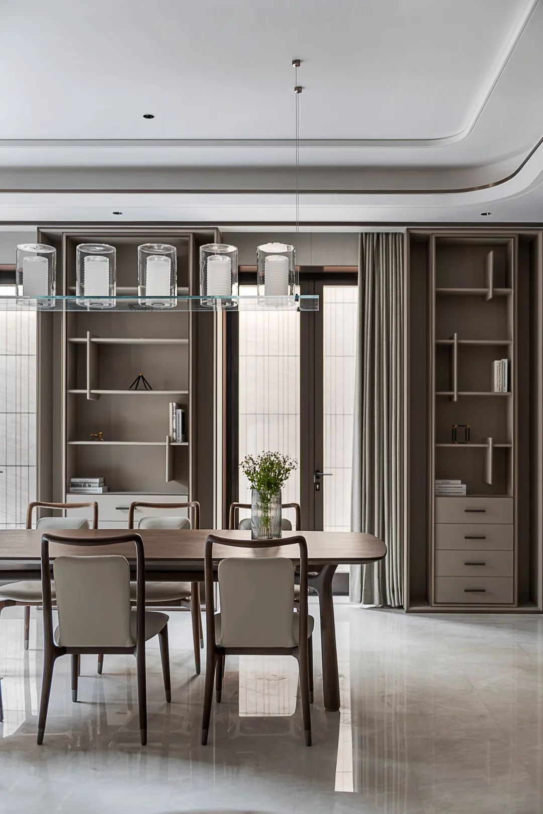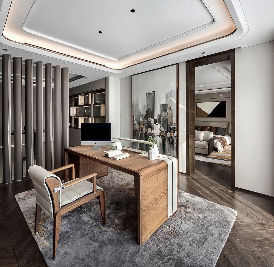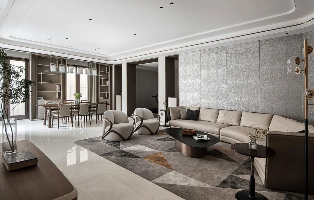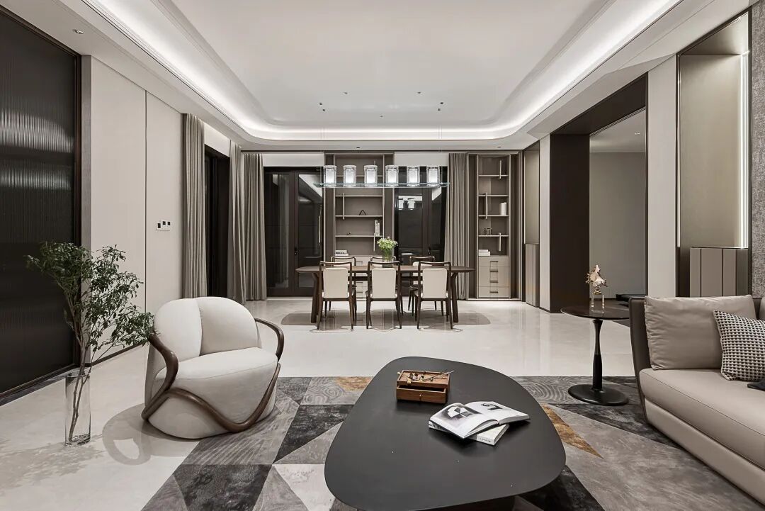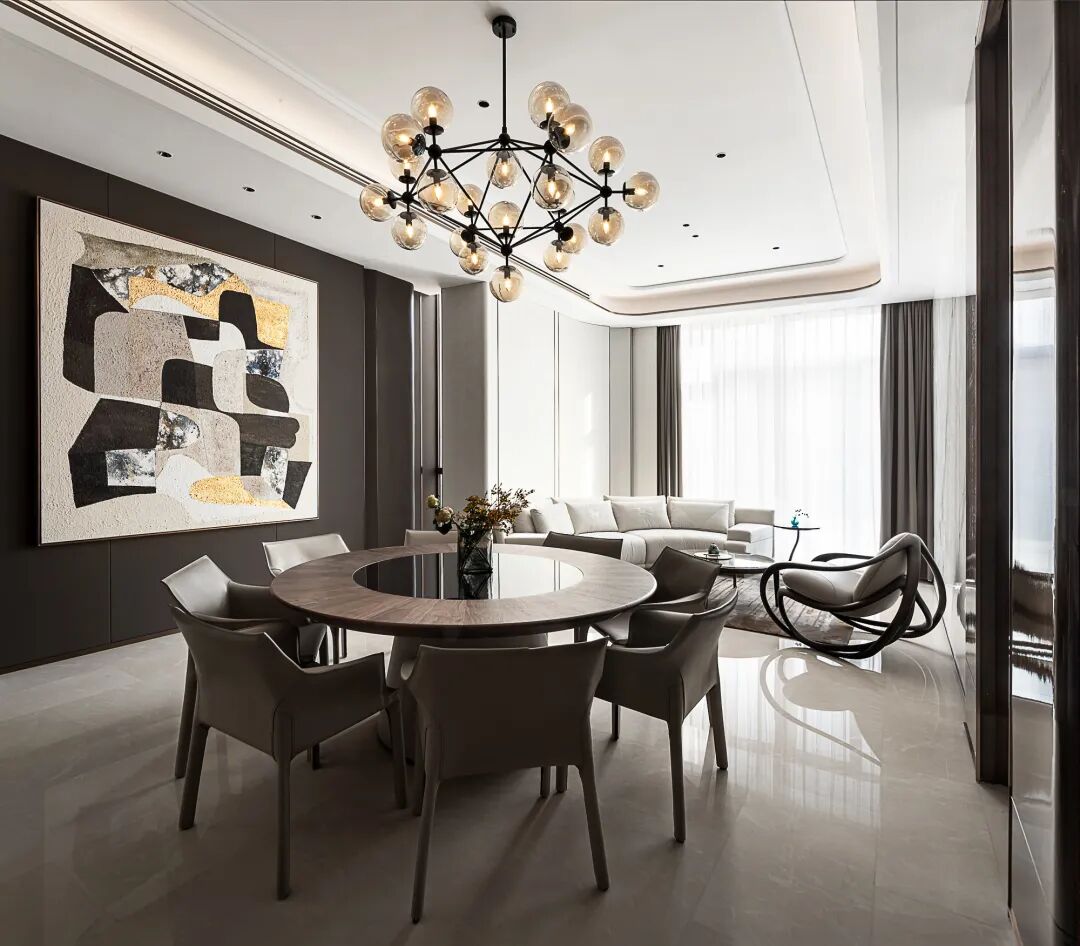 The home is symmetrically arranged and has a strong sense of array. Dark brown and beige tones are used as the main colors of the home space. The combination of cold and warm creates the etiquette and aura that a mansion should have between the square inches. A large-scale art painting is located at the end of the space and becomes the visual focus. The dark brown grille screen serves as a space divider, teasing light and shadow, and has a melody like music.
