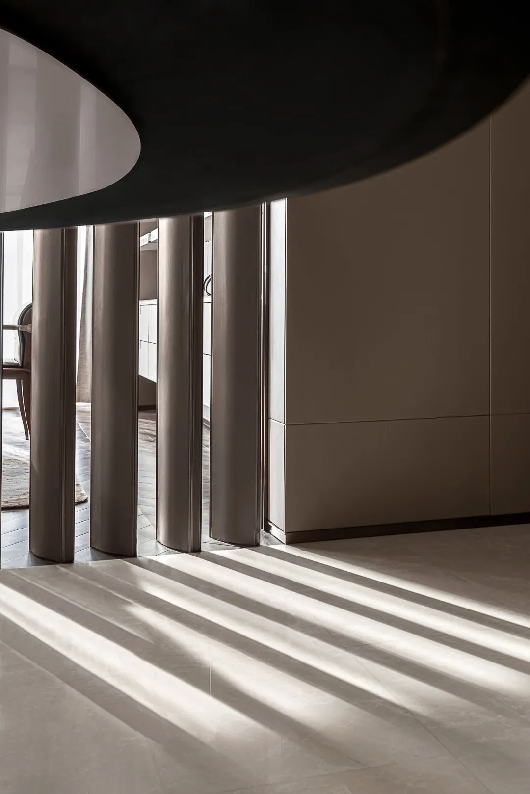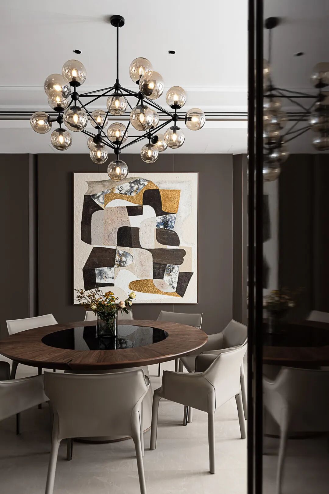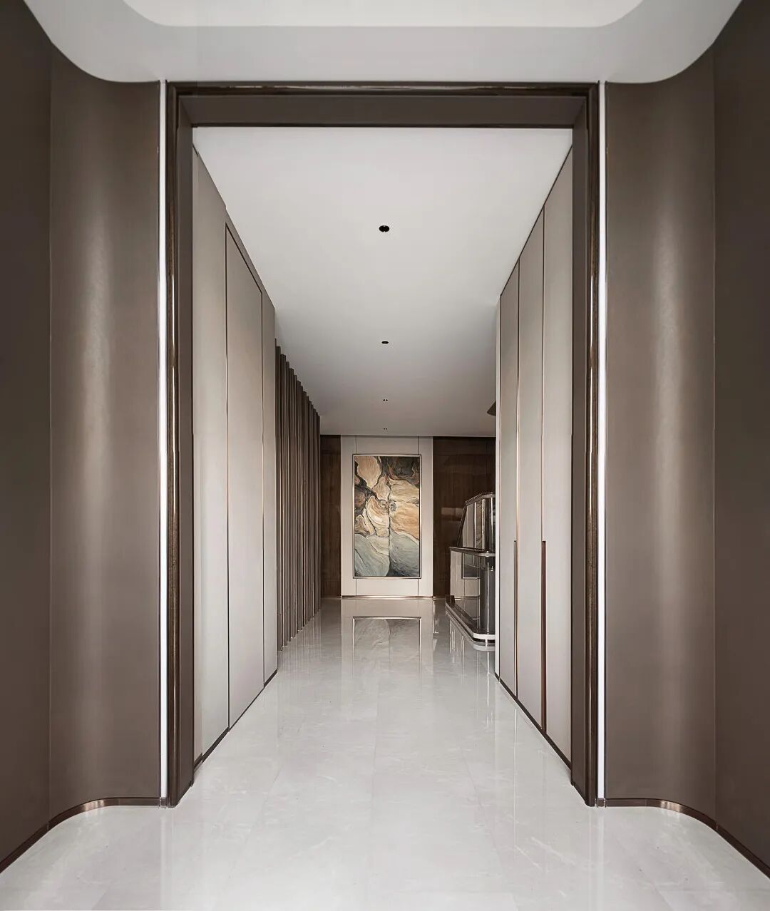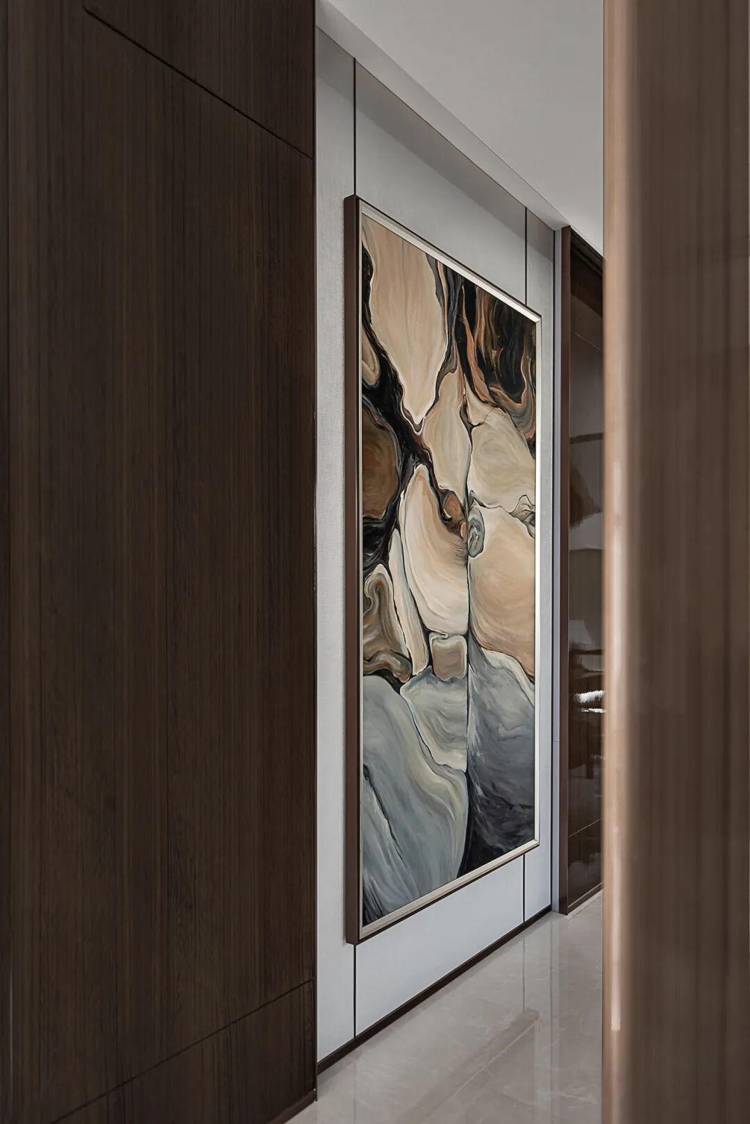 入户对称排布、阵列感强,深棕与米色调作为入户空间的主色调,冷暖搭配,在方寸之间营造出豪宅该有的礼仪和气场。一幅大尺度的艺术画位于空间尽头,成为视觉焦点。深棕色格栅屏风作为空间分隔,挑逗光影,如音乐一般有了旋律。