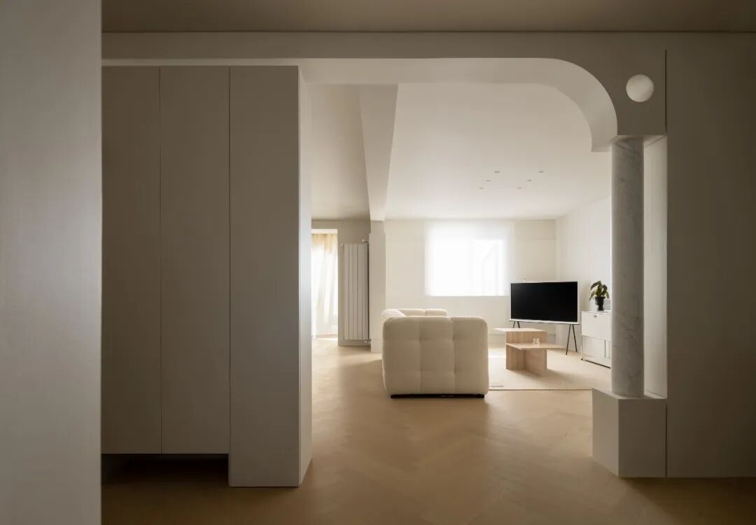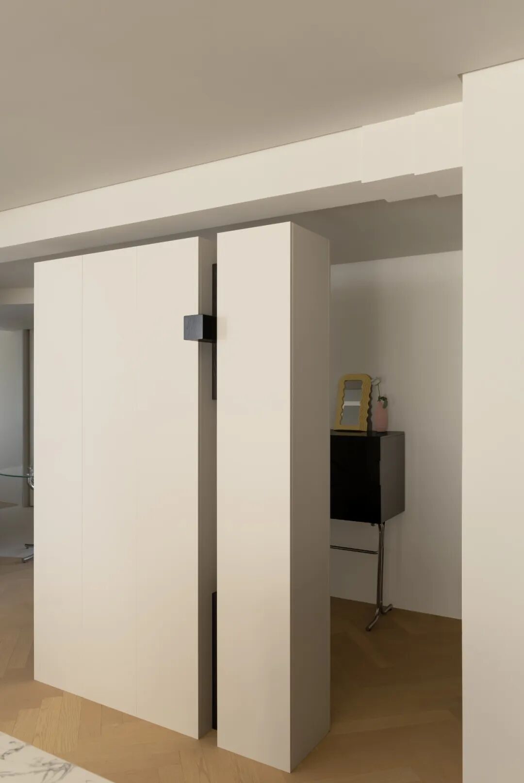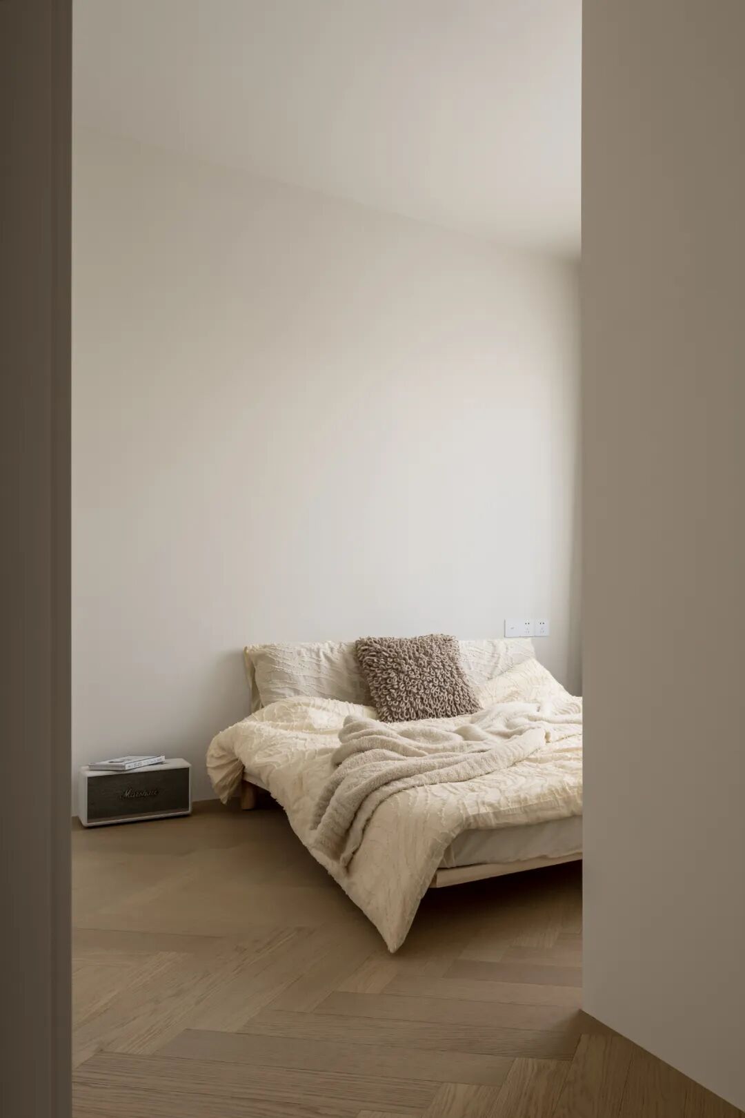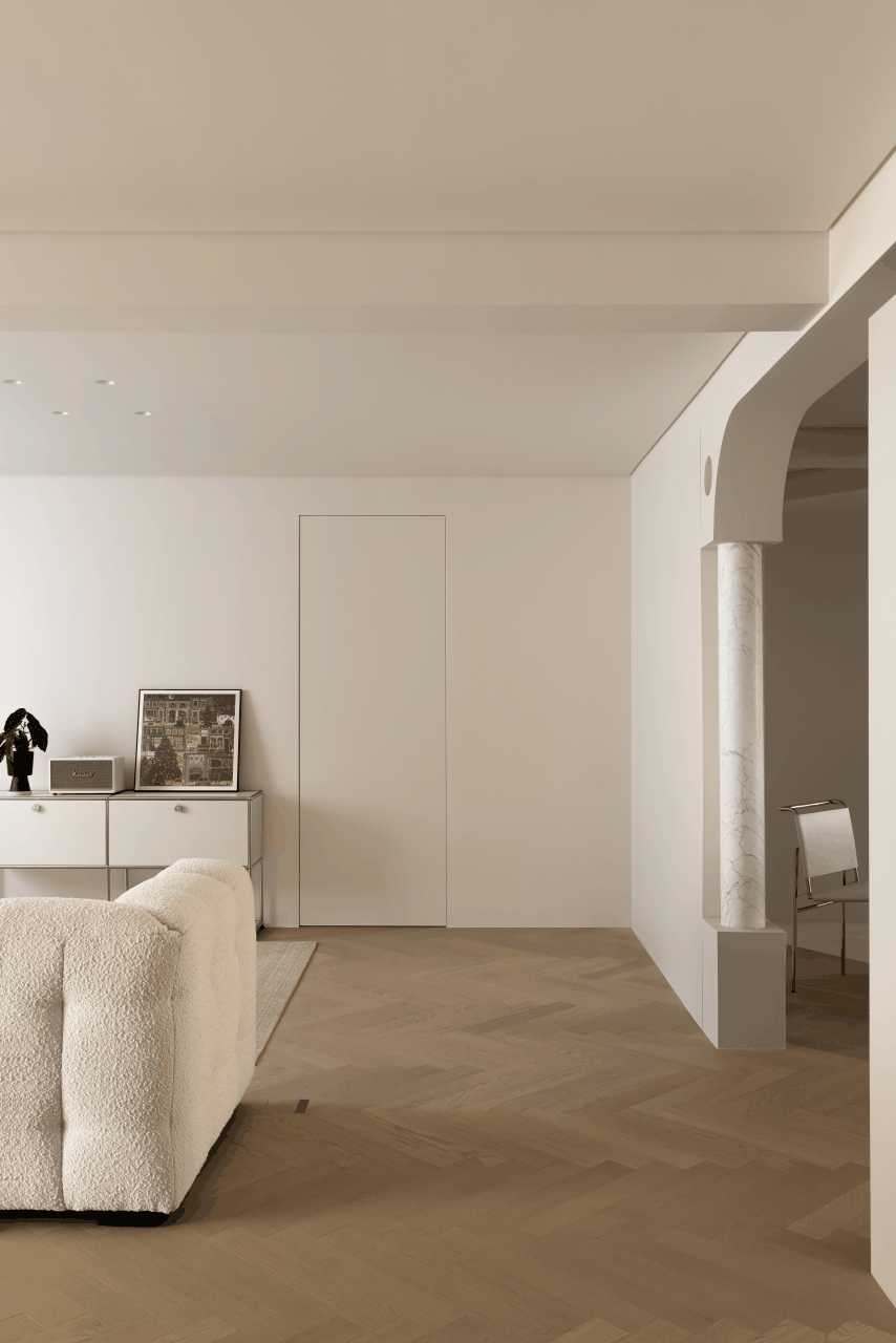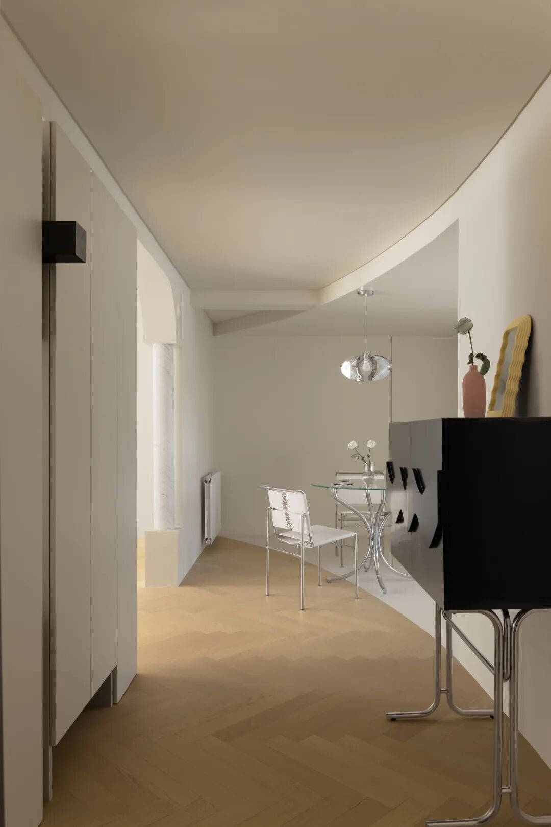 The household shoe cabinet is placed in it as a separate block. The top surface curve breaks the restraint of the space. The stitching of the ground wooden floor and the tile echo this, and use the building structure to add a strong stroke.