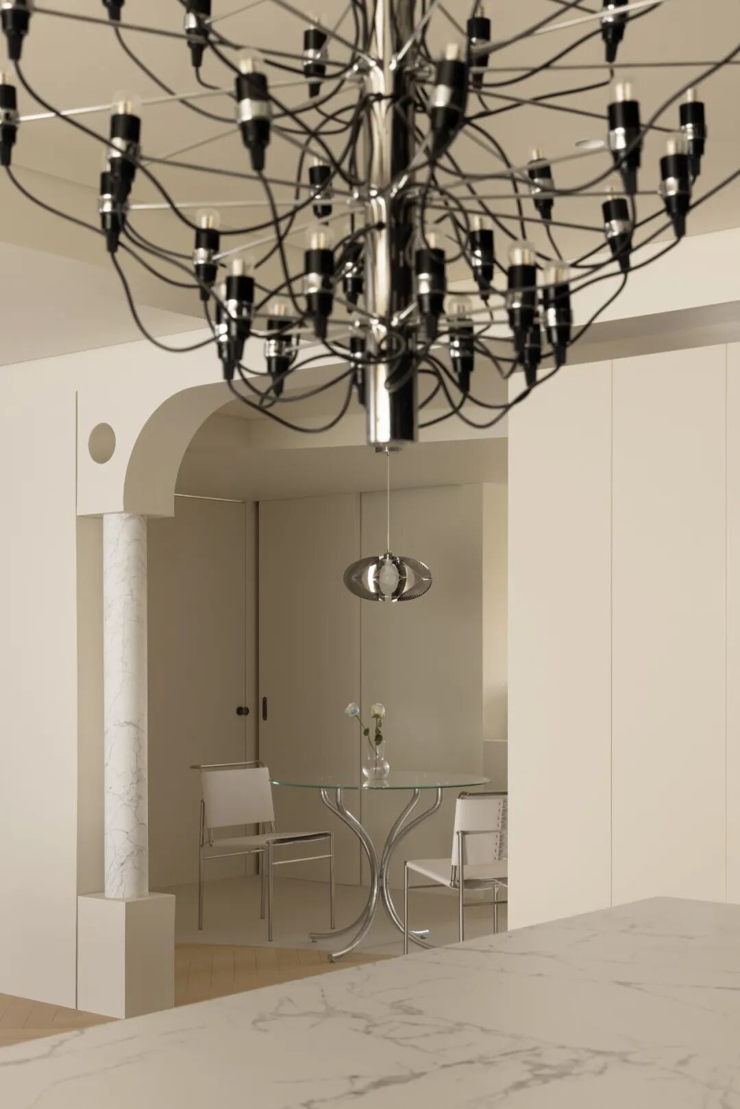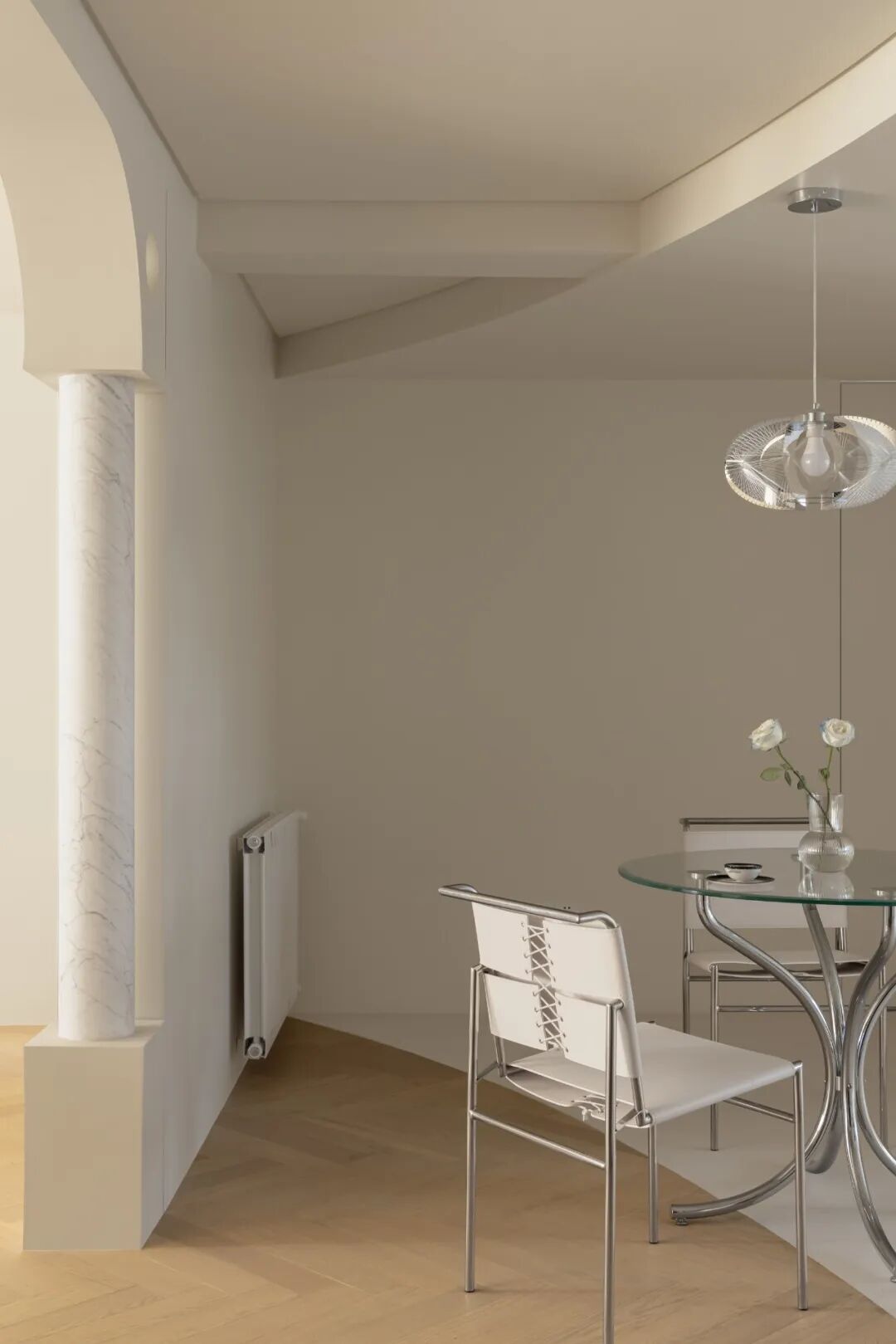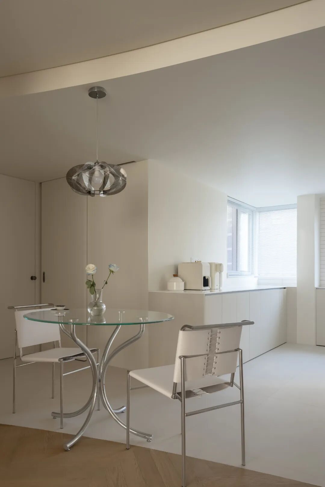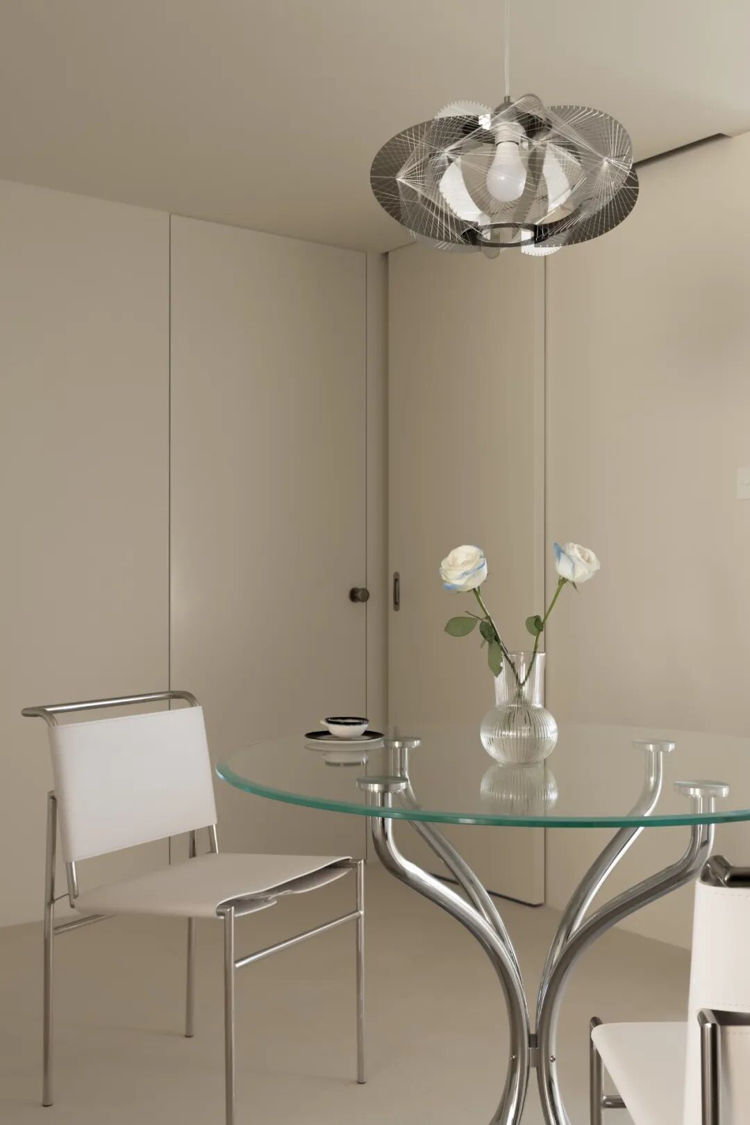 造型独特的玻璃圆桌为整个温柔的空间带来张力与跳跃,也与空间曲面元素呼应。