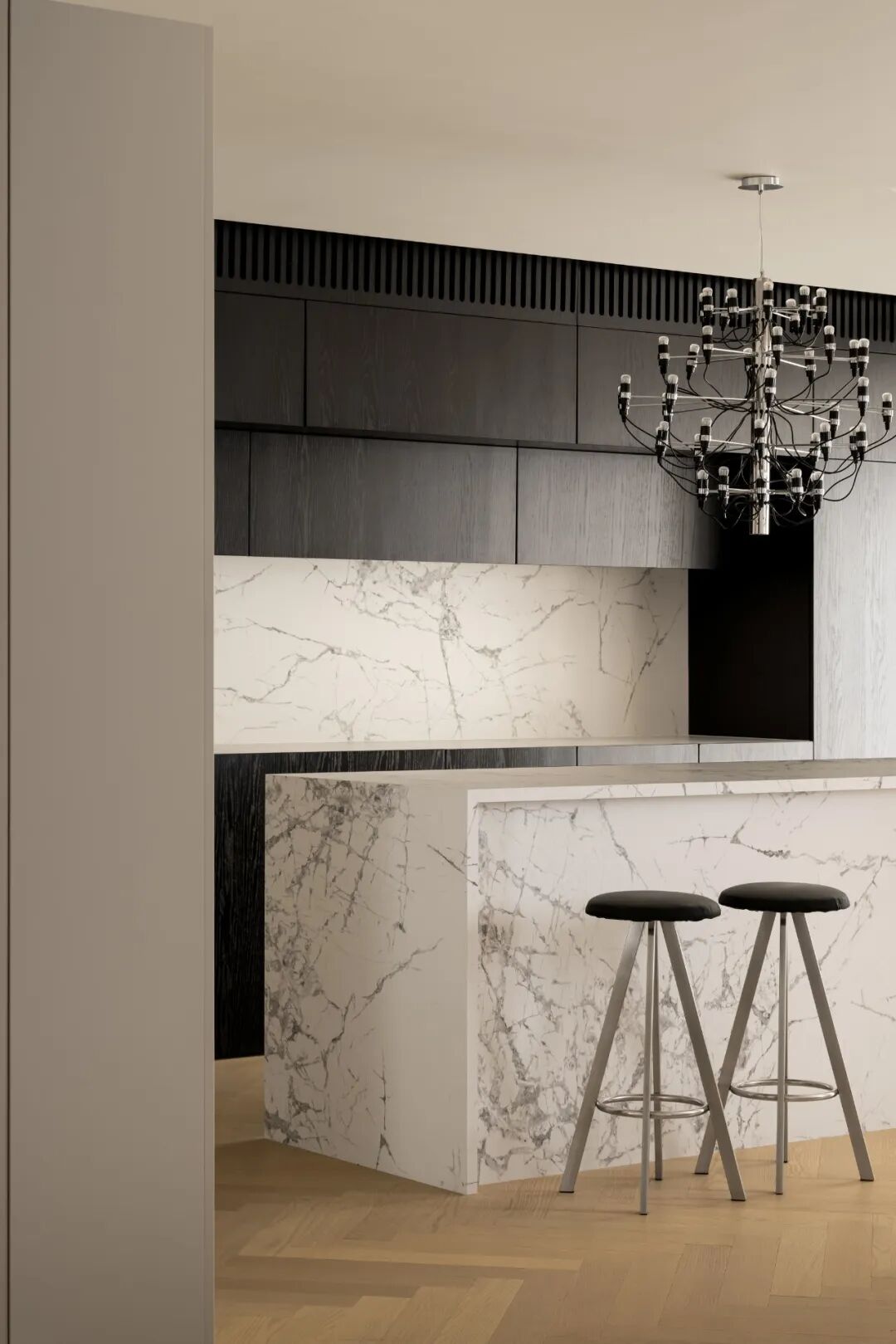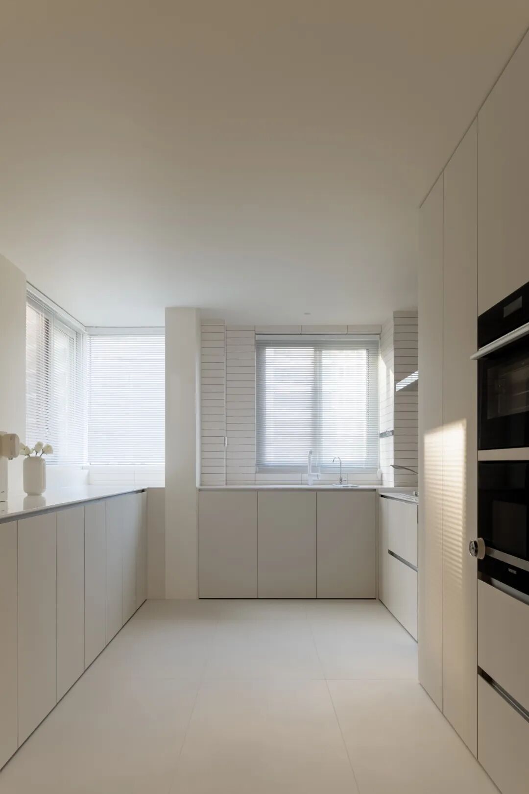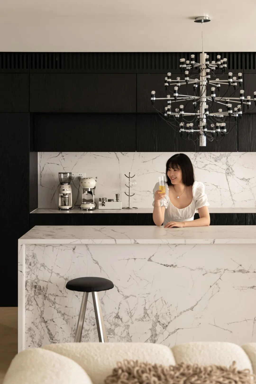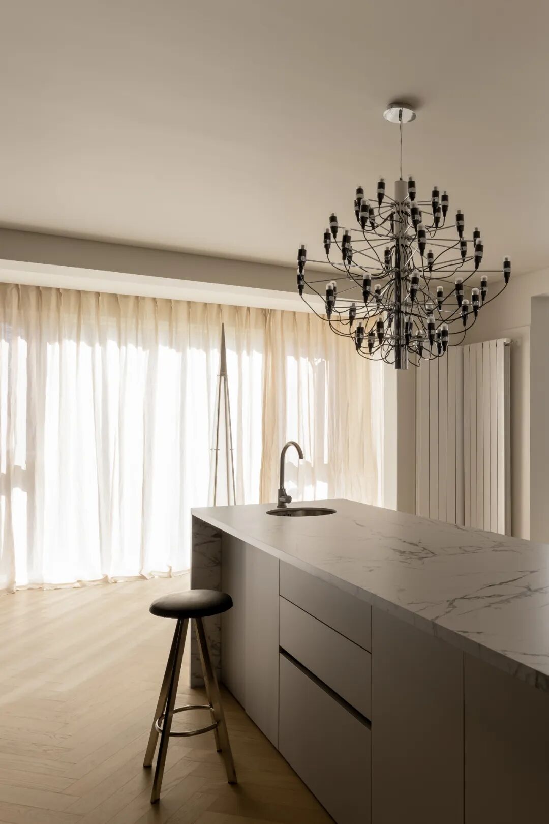 Silver chandeliers and saddling stainless steel dining chairs are exquisite items. There are a large number of facade storage storage on the kitchen platform to ensure the convenience of home life.