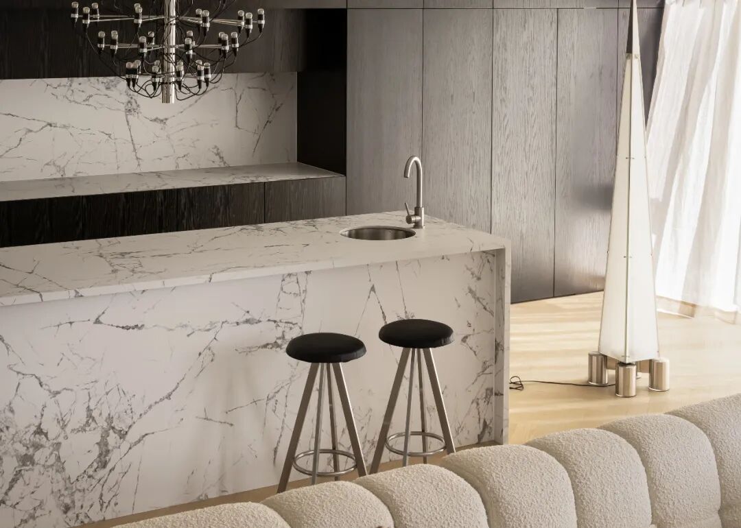 The unique glass round table brings tension and jump to the entire gentle space, and also echoes the space curved elements.