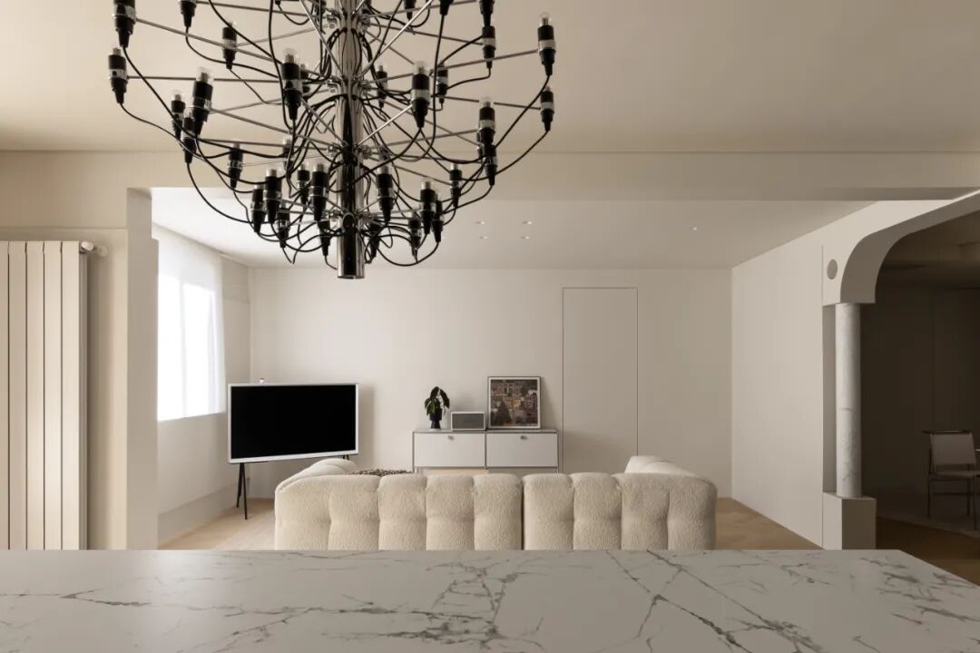 这是本案的入户视角,针对客餐厅之间不可拆除的承重墙,用石材立柱增加层次关系。
