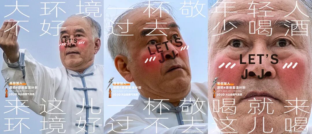 在此次JOJO气泡酒选择与老大爷合作的互动,并在之前父亲节的短片中就以长相严肃的大爷,并配合着我们熟悉的养生拳,一本正经魔性重复着一句话的「年轻人少喝酒,喝就喝 JOJO」,这样一边劝年轻人少喝酒,一边安利JOJO酒,也带给年轻人别样的内容呈现,反而反差地吸引用户的注意。