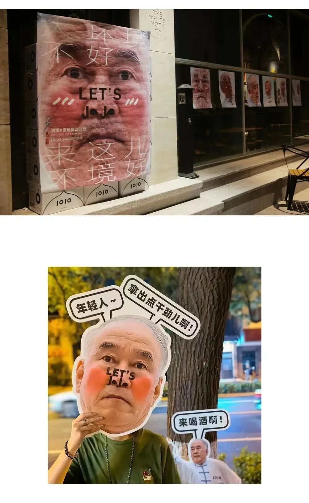 值得一提的是,JOJO酒甚至将大爷做成了品牌的门面担当,推出了各种周边人形牌,让用户可以近距离的拍照互动,从而让品牌的这份有趣更加深入人心。