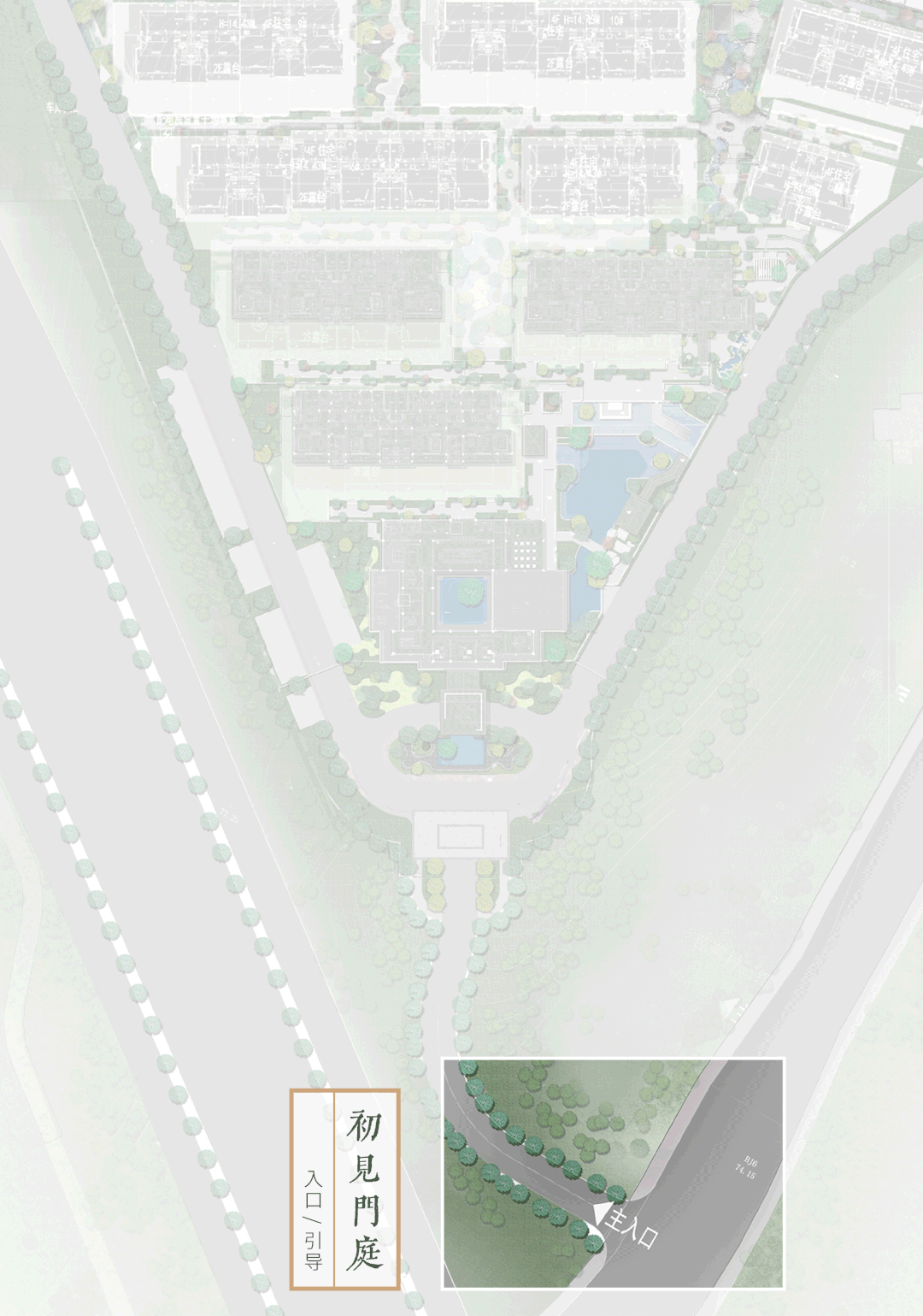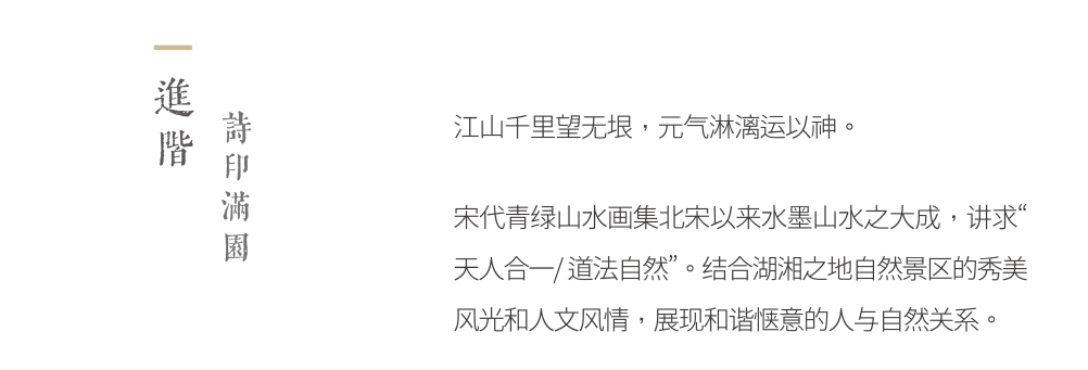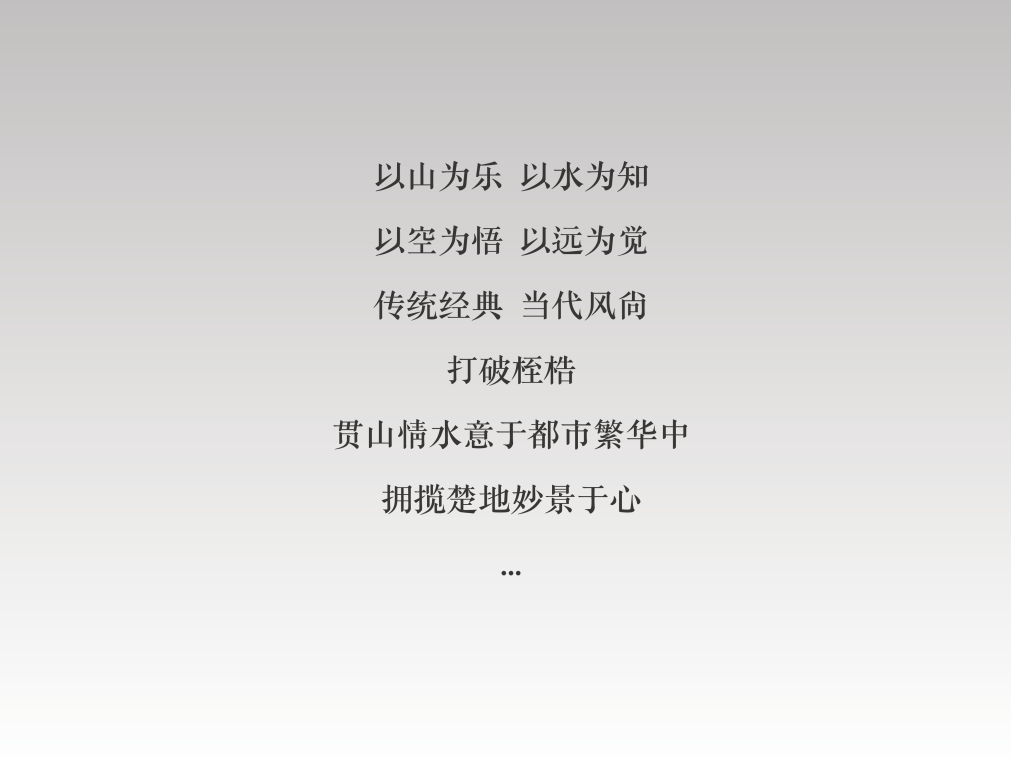 以中式风格为主基调, 以水墨山水之大成-山水画为灵感源泉,映射可居可游的思想与理想人居环境。打造开合大气的迎宾入口、酒店式的落客广场、芥子纳须弥的古典园林式中心景观、深幽雅致的巷道及闲情惬意的庭院空间。