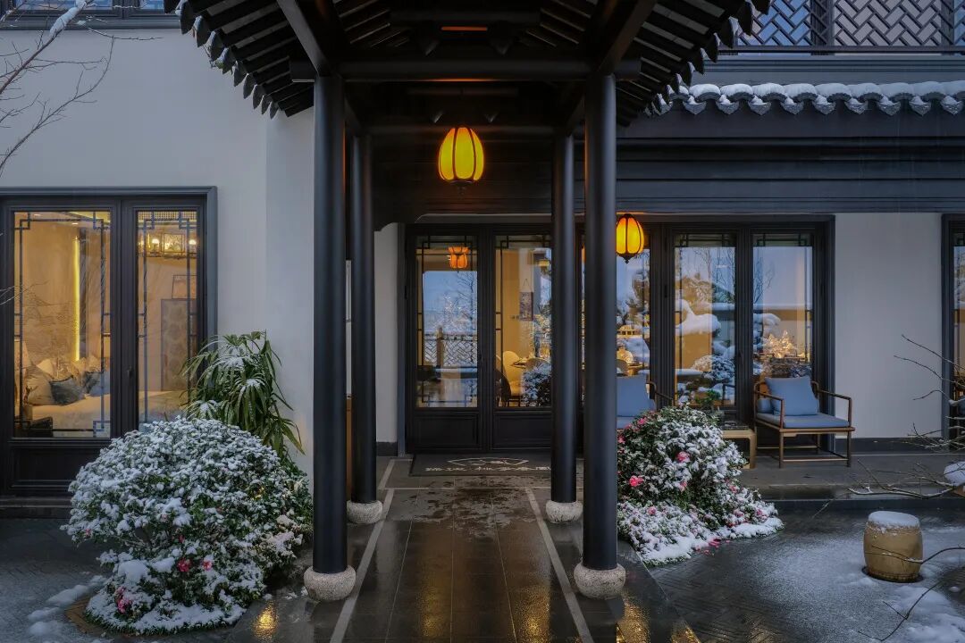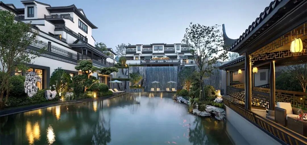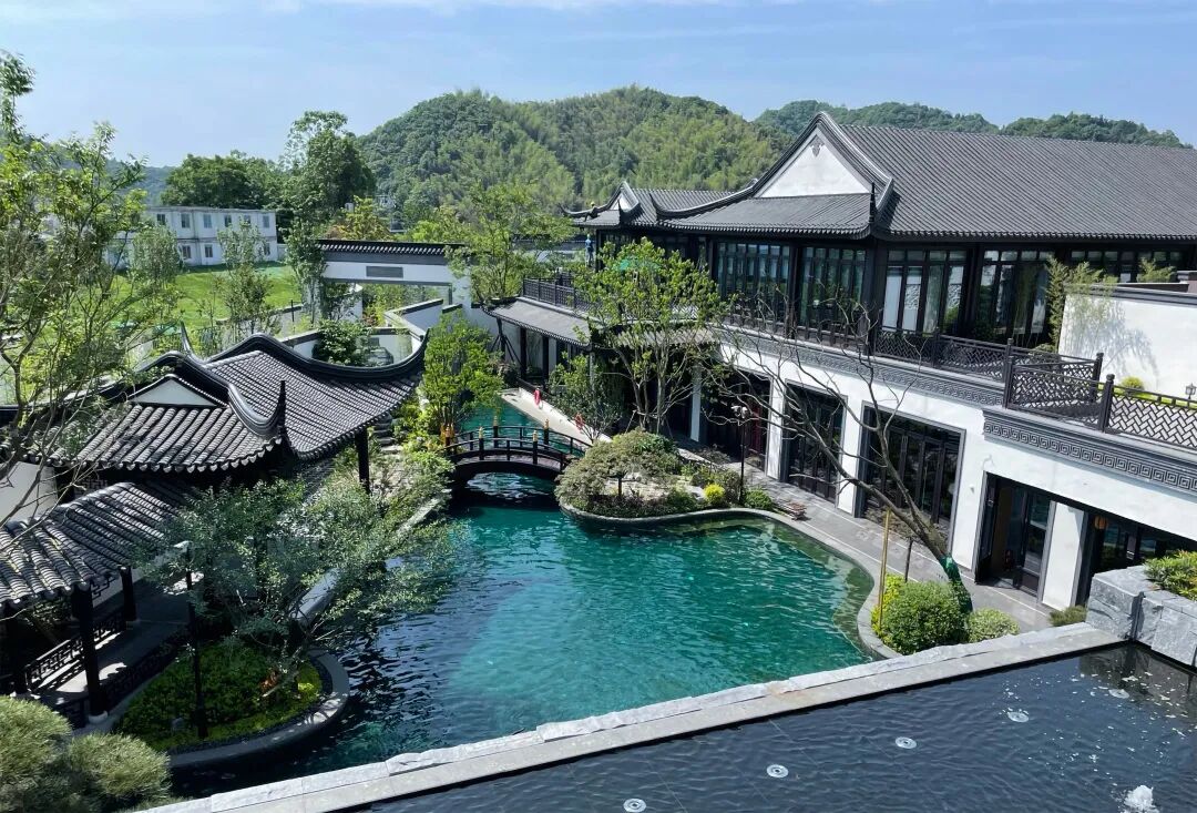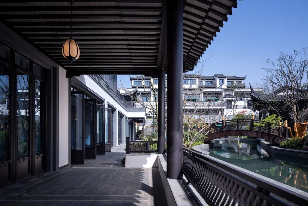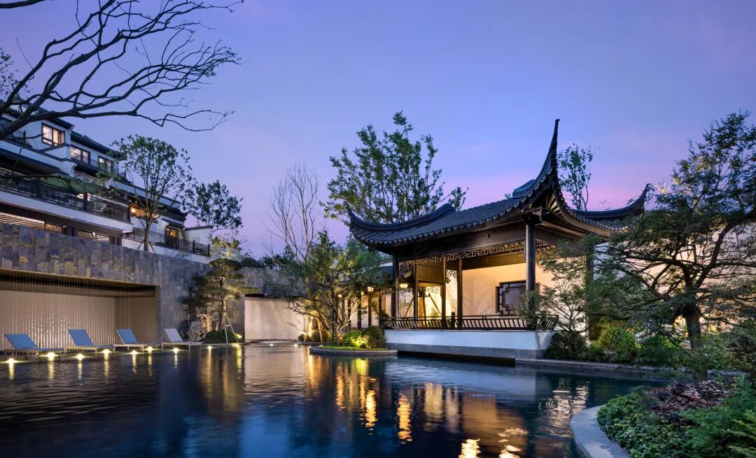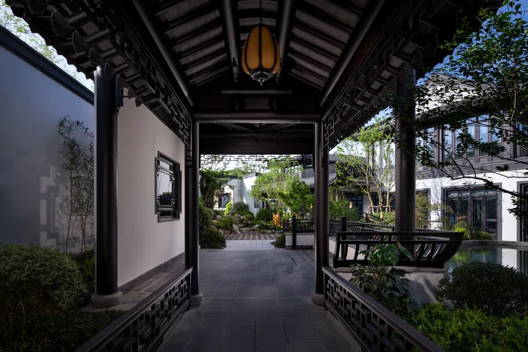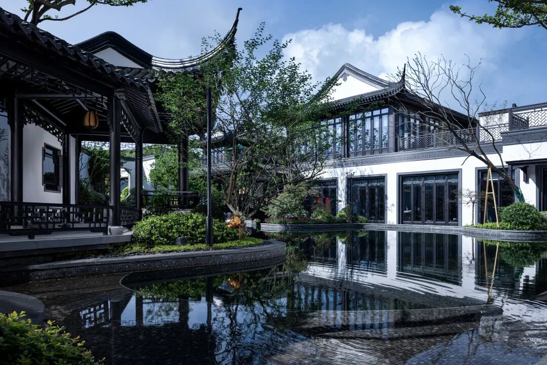 江南的风雅颂,如画卷般缓缓铺展。虚实结合的封闭与开放节奏贯穿整个度假泳池式殿堂水院