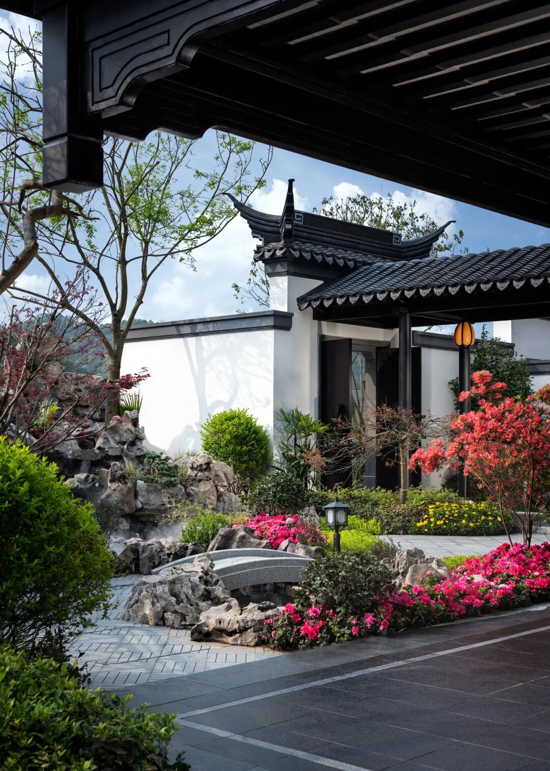结合古典园林文化的价值内核和现代化语境,松岛主景、特色地雕、迎宾跌水以及障景后尽显磅礴气势的中式门楼交融成趣,打造沉稳浑厚的空间礼序。