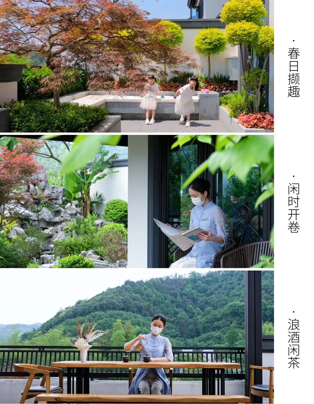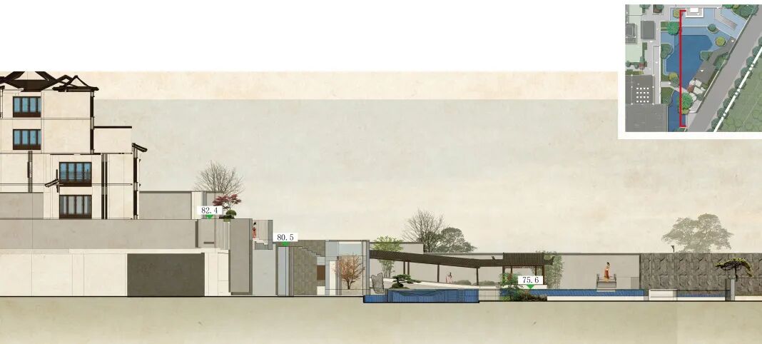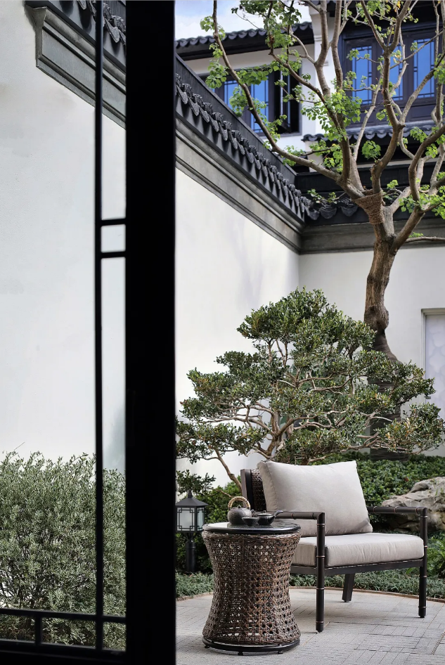 将适宜的尺度、功能糅杂进这一方小天地中,通过借景、框景等手法,将院外风景纳入院内在小尺度的样板庭院空间内营造丰富的视觉体验,言有尽而意无穷。