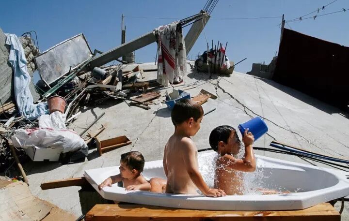 他只能把浴缸搬到废墟上,每天早上给他的孩子洗泡泡澡。