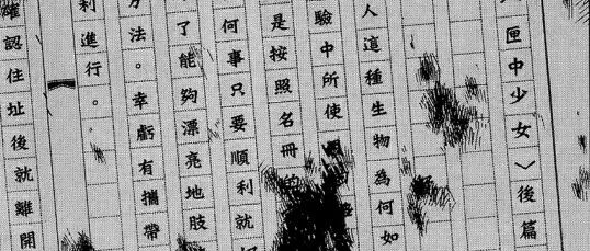 而后他怕证据被湮灭,赶紧又进了久保家仔细翻找,打开房间的灯后,他才发现房间里到处都是血迹,而那桌子上放的是久保写的《匣中少女》后篇,稿纸上的斑斑血迹和里面的内容都在无声地述说这里的惨剧,抽屉里还放有御筥神教团的名册。